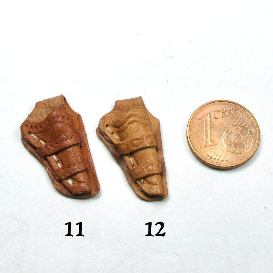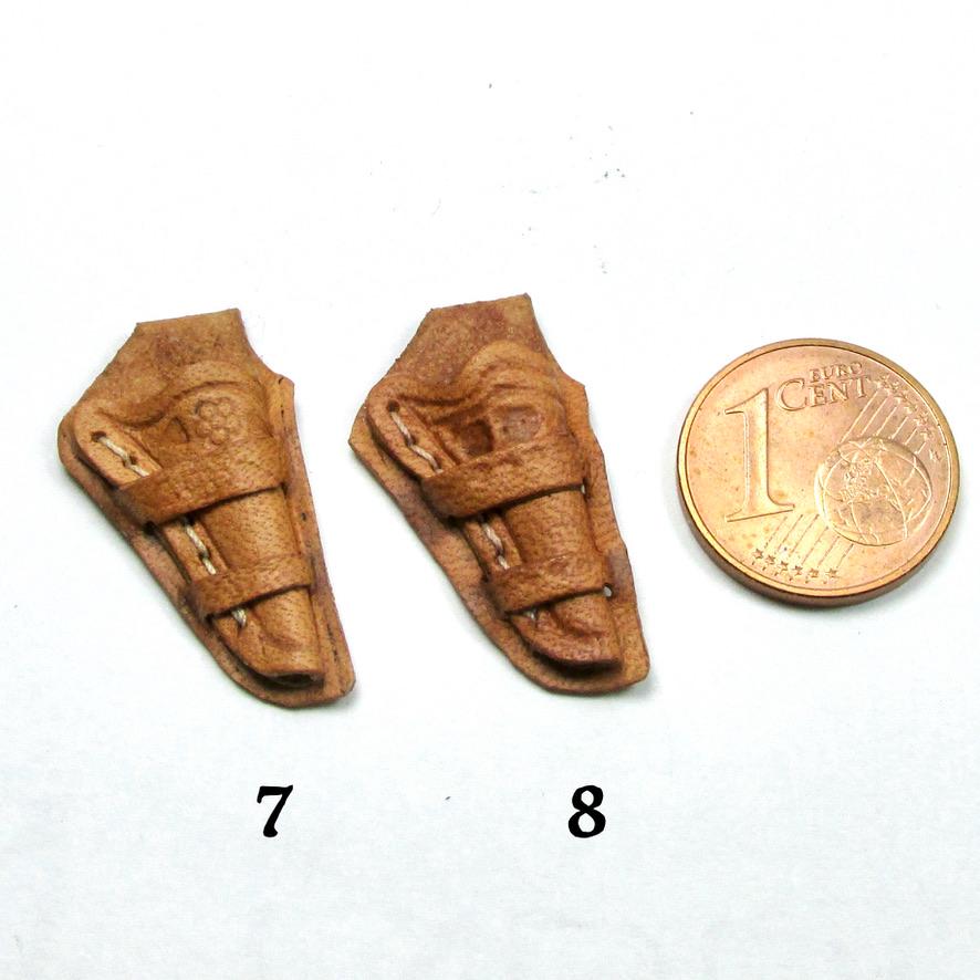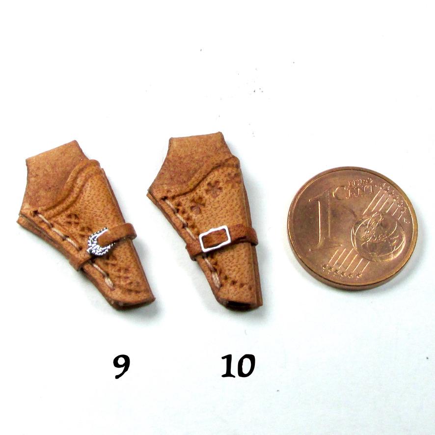 Miniature revolver holsters, with or without belt, completely handmade in embossed leather, in perfect Far West style, in different models. The belts are completed with a worked metal buckle and studs, and the holster is hand-sewn. The revolvers, a perfect replica of the historic Colt 45, are made of 925/000 silver casting with enamel painted grips. One model is burnished with liver of sulfur, the other is left in silver color. 1/12 scale
