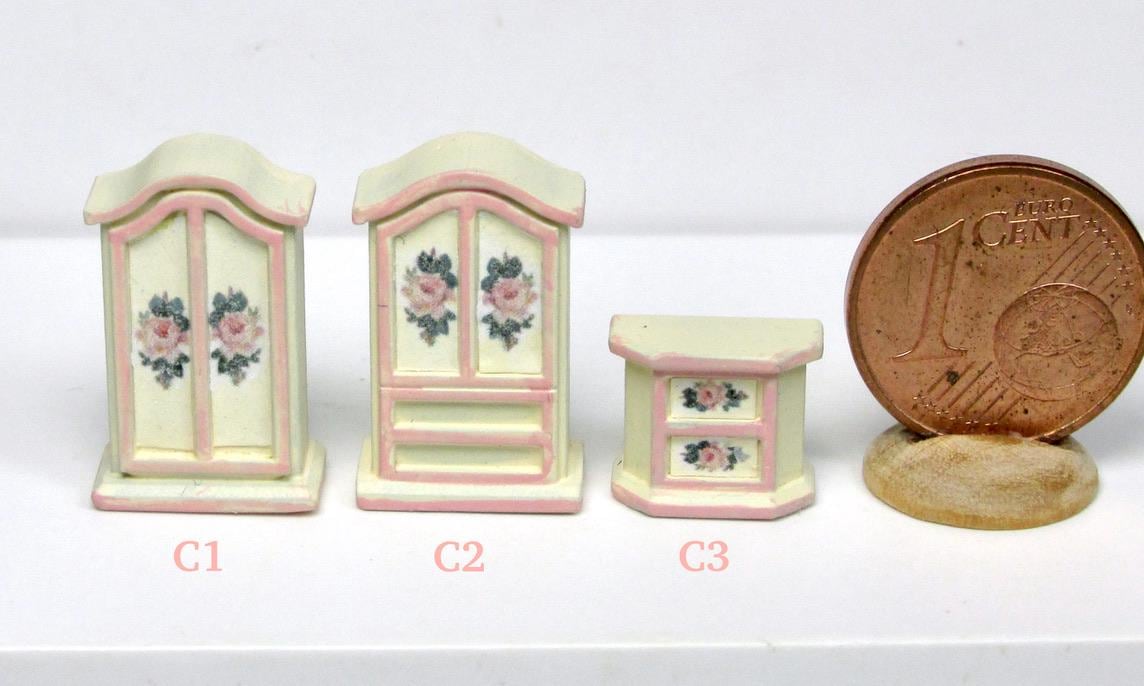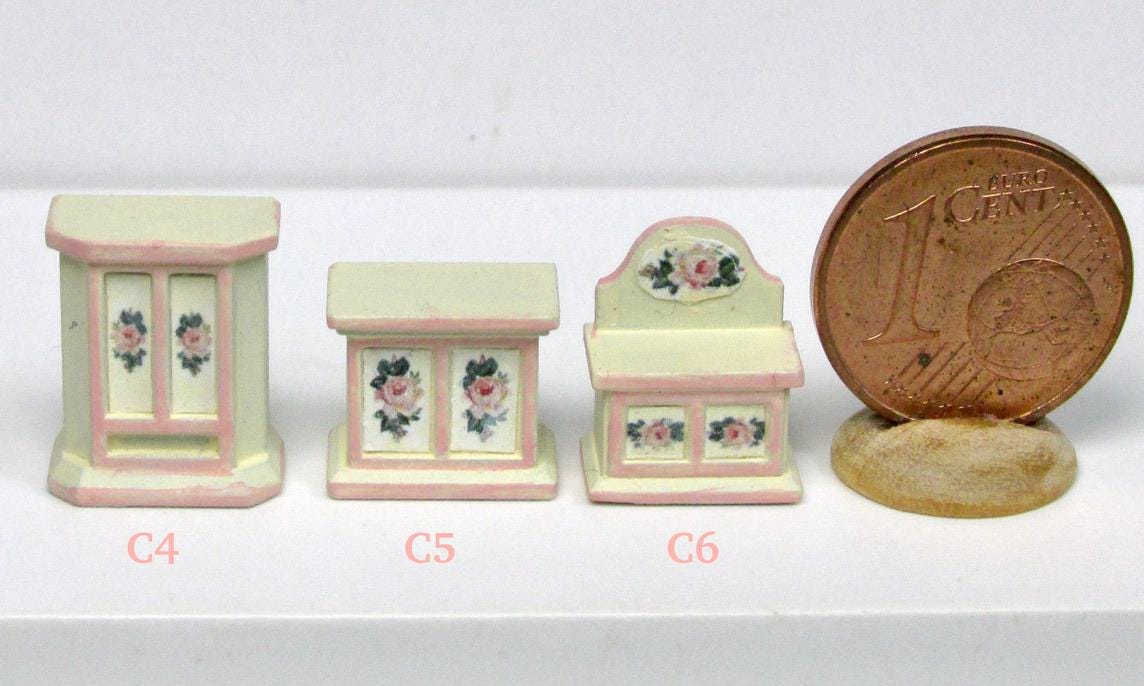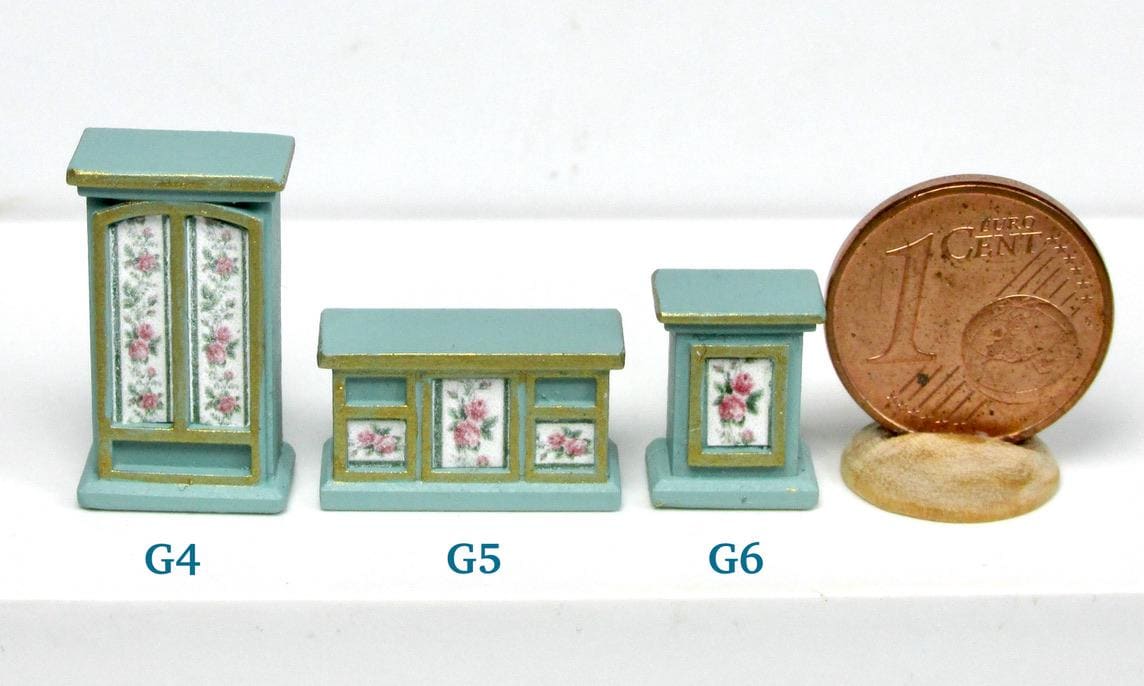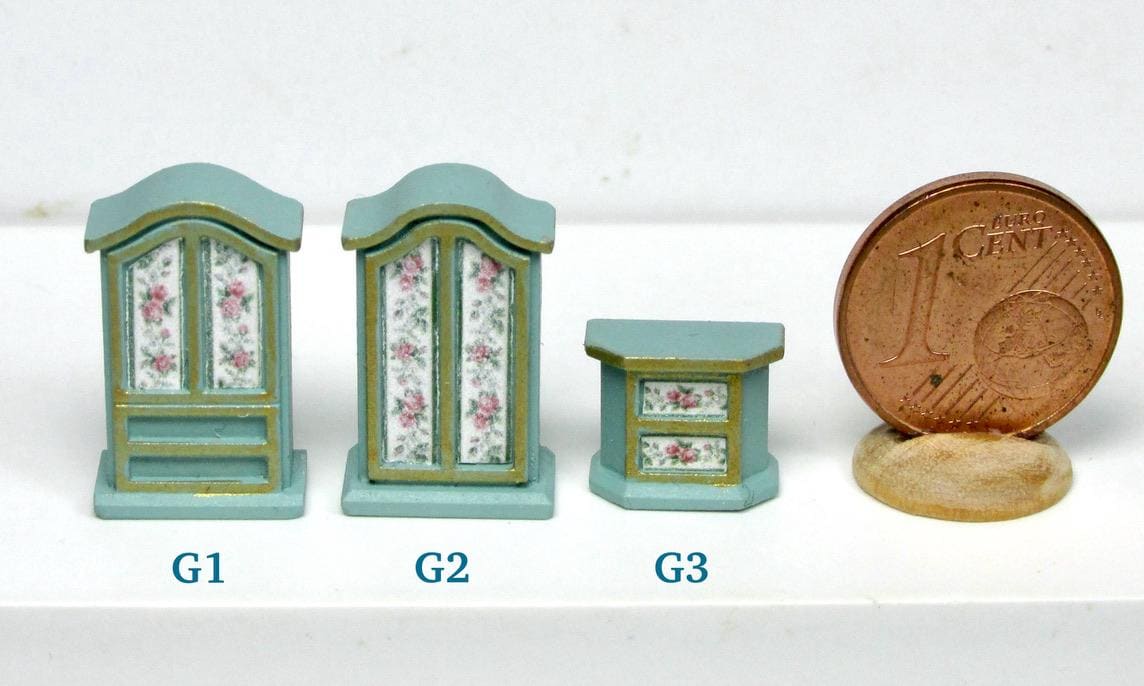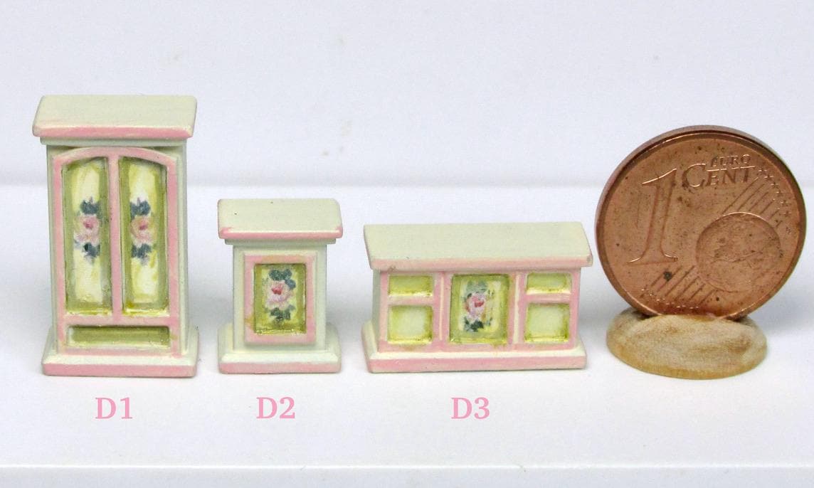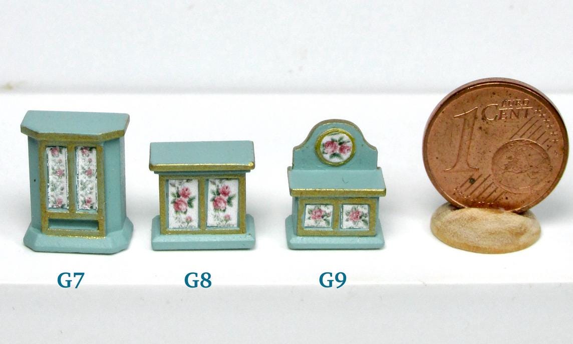 If you have one baby house cabinet, and have been at a loss as to how to finish it,you have to use 1/120 scale furnishing. The baby house does NOT use 144th scale furniture., which is way too small. I product alcuni pieces to finish such a beautiful piece of furmiture. I think you will agree that the pieces in this scale are just perfect to fill the rooms attractively. As this article is hand made, colors and decorations may subject to some slight variations.