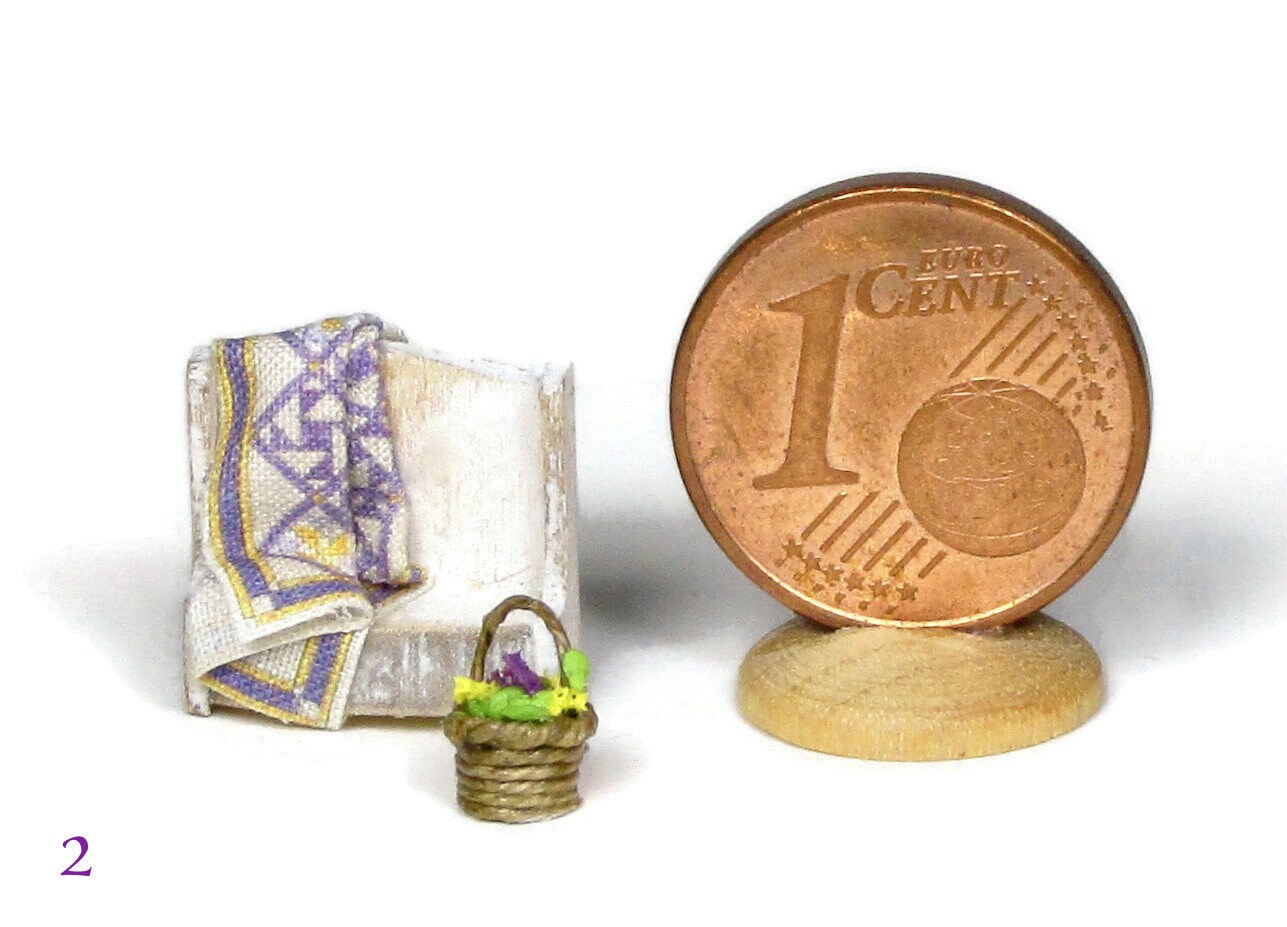 The small bench, painted and finished in shabby chic style, is handmade in wood, in 1/144 scale. It is sold both empty and combined with the blanket and basket.