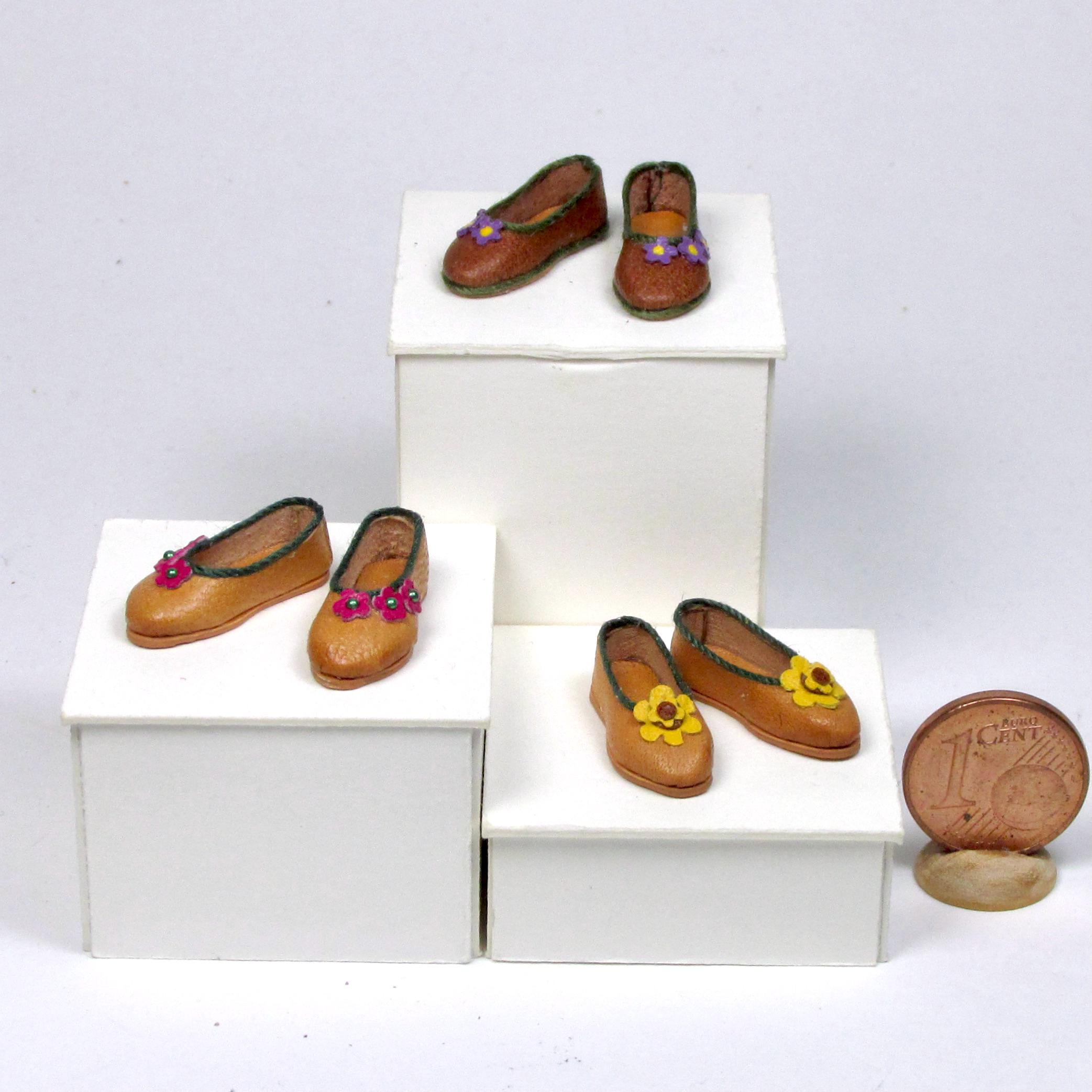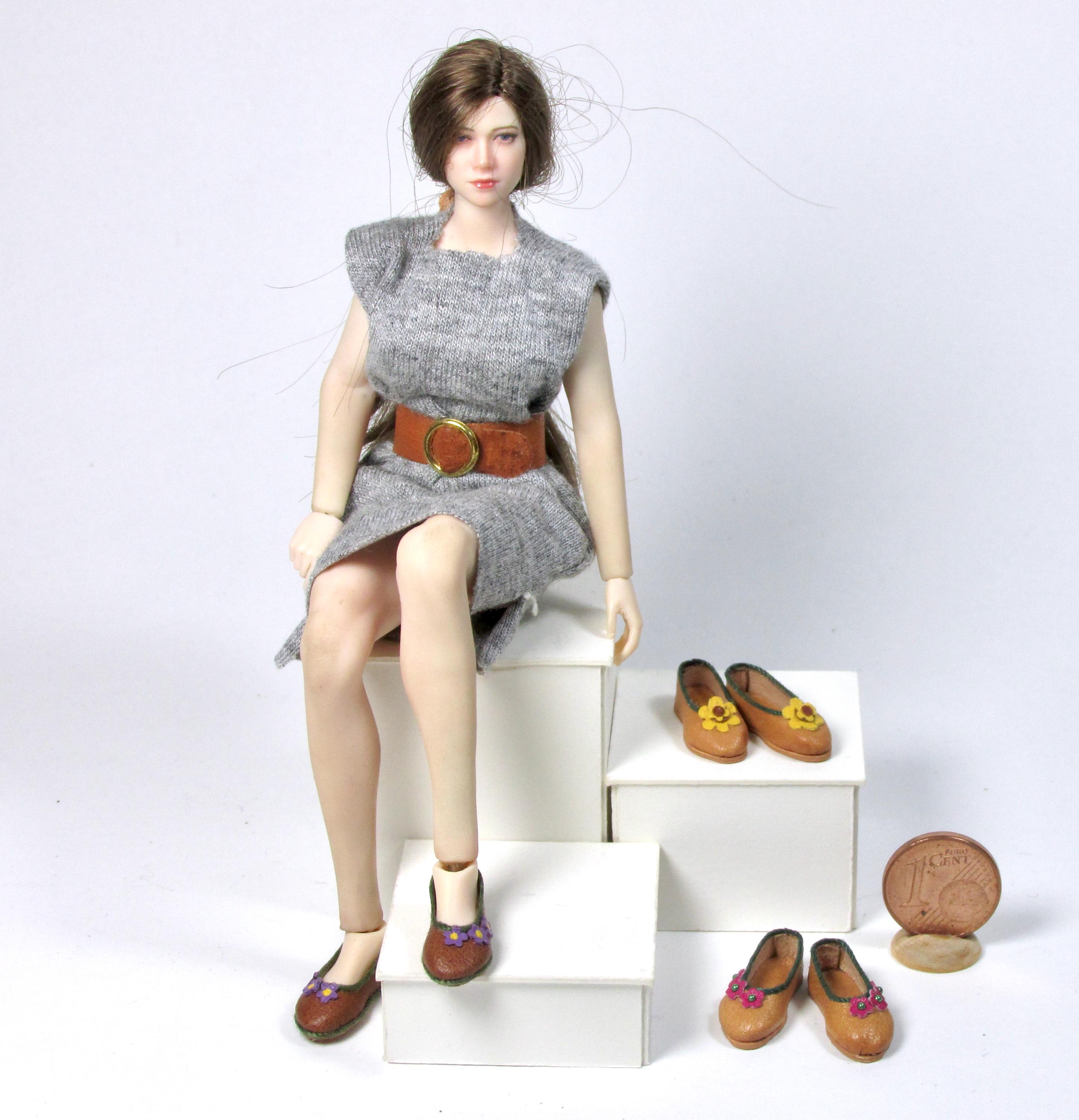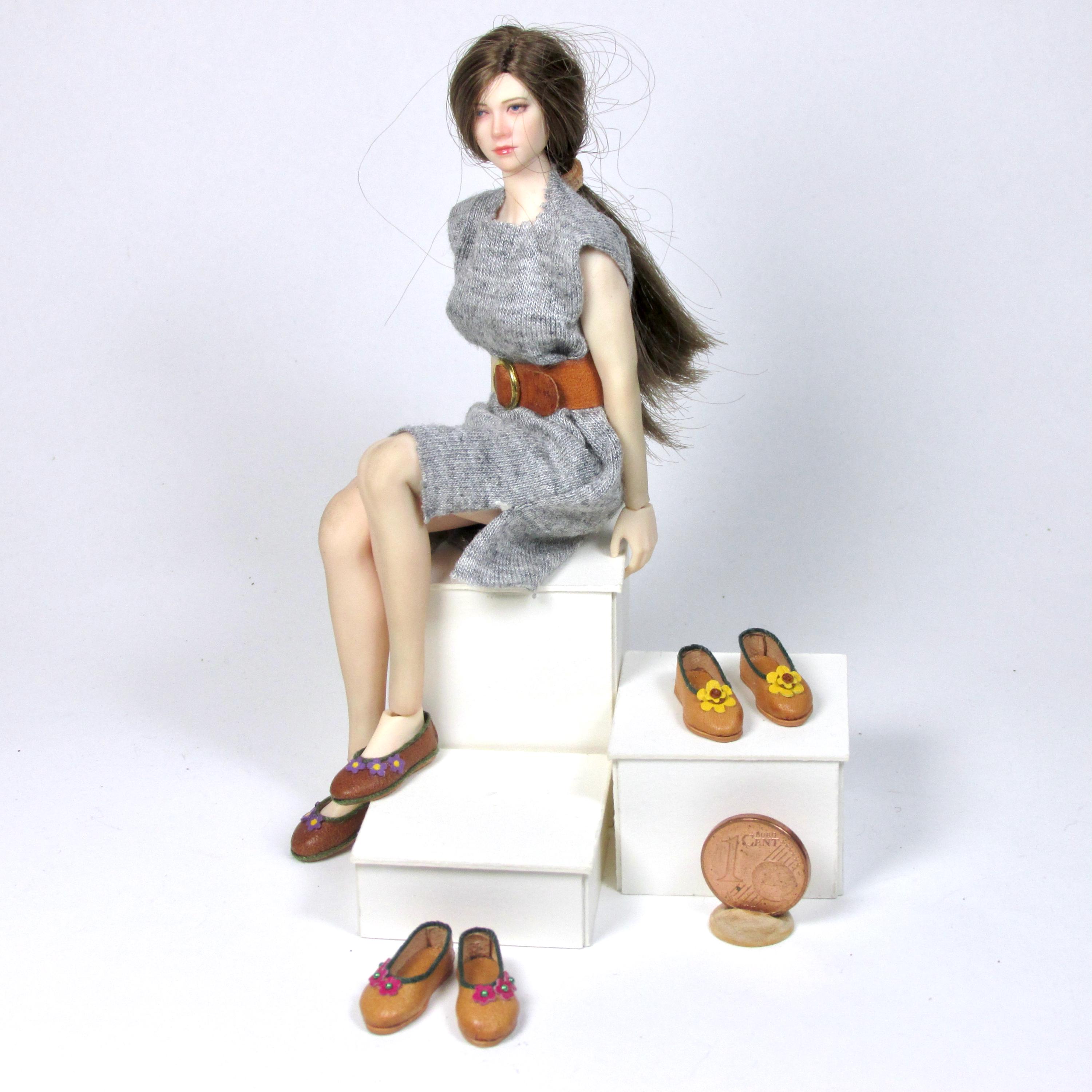 Ballerina model shoes, handmade in leather, tailored for Phicen TBLeague in 1/12 scale. The shoes of this model are low-cut, without lining, with very low heel and flexible sole. They adapt perfectly to the doll's foot, and the different colors and decorations allow them to be combined with many outfits.