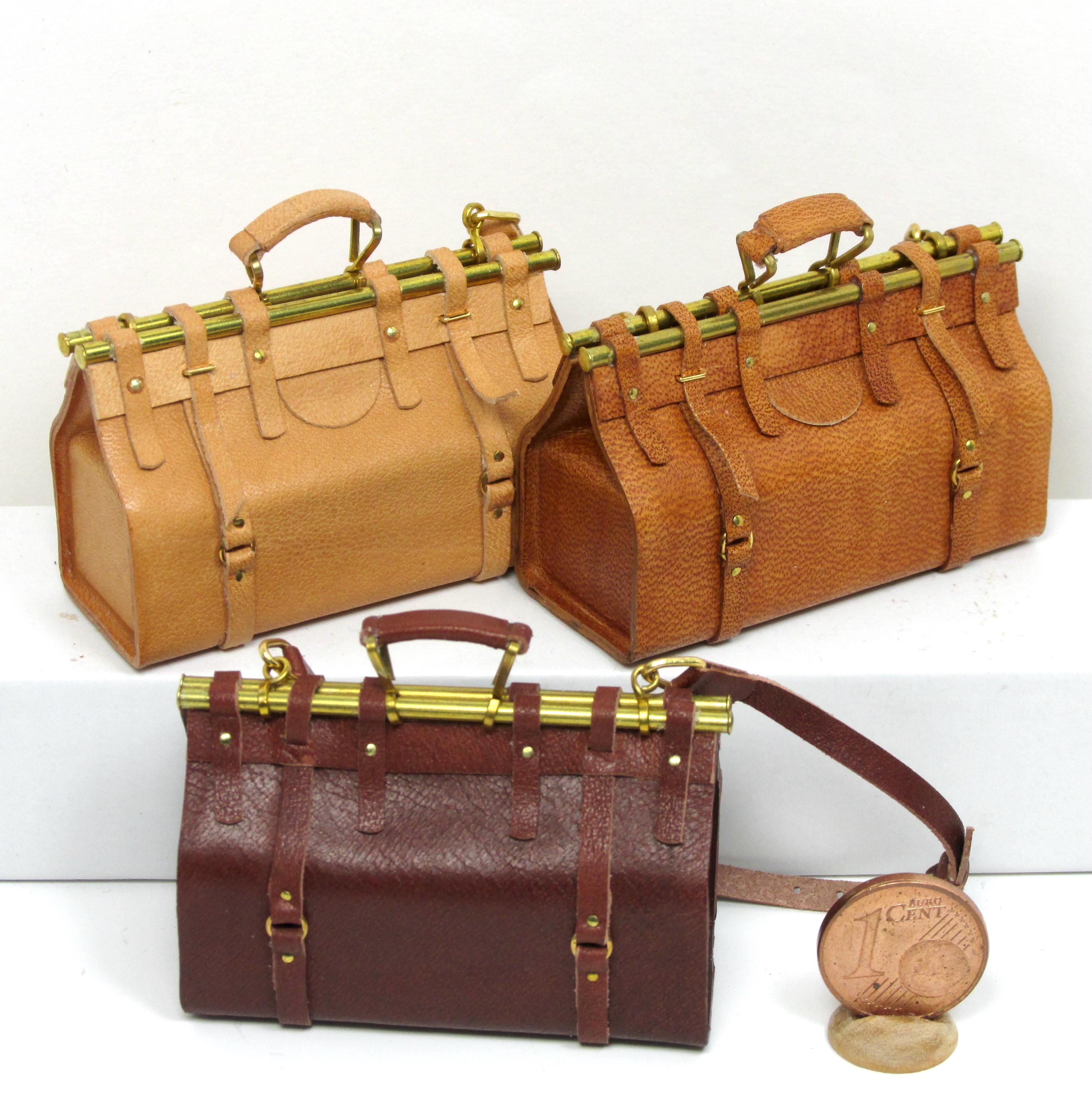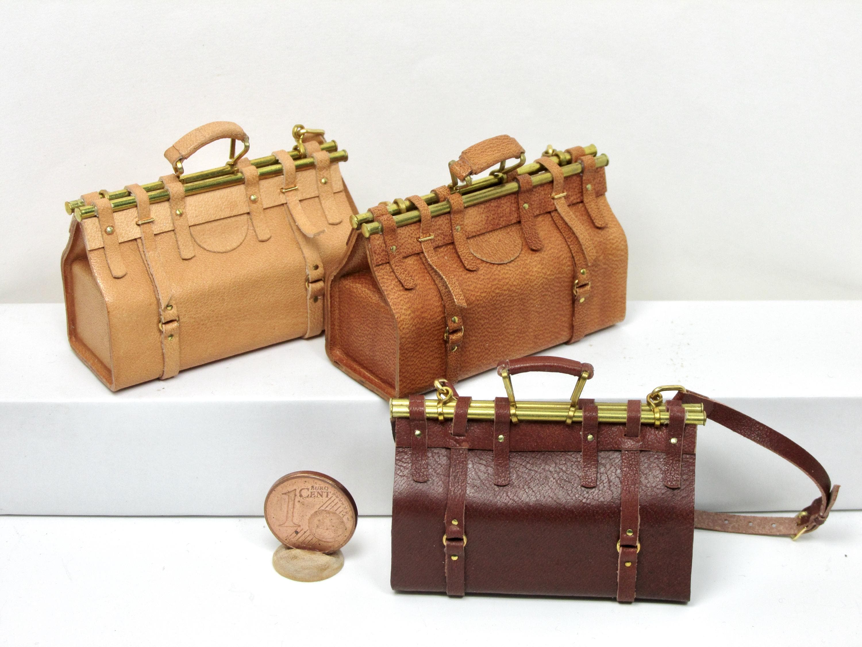 Travel bag, with an old-time look, completely handmade in natural leather in two different colors, light and dark. The model of this bag is faithfully taken from the old travel bags used by men who traveled by stagecoach or steam train and who could not move with bulky luggage, and which therefore had to be sturdy and roomy. The bag is equipped with buckles, studs and straps and closed with an ingenious system of brass pipes which allowed it to be opened and closed with two simple straps, keeping it rigid. 1/12 scale