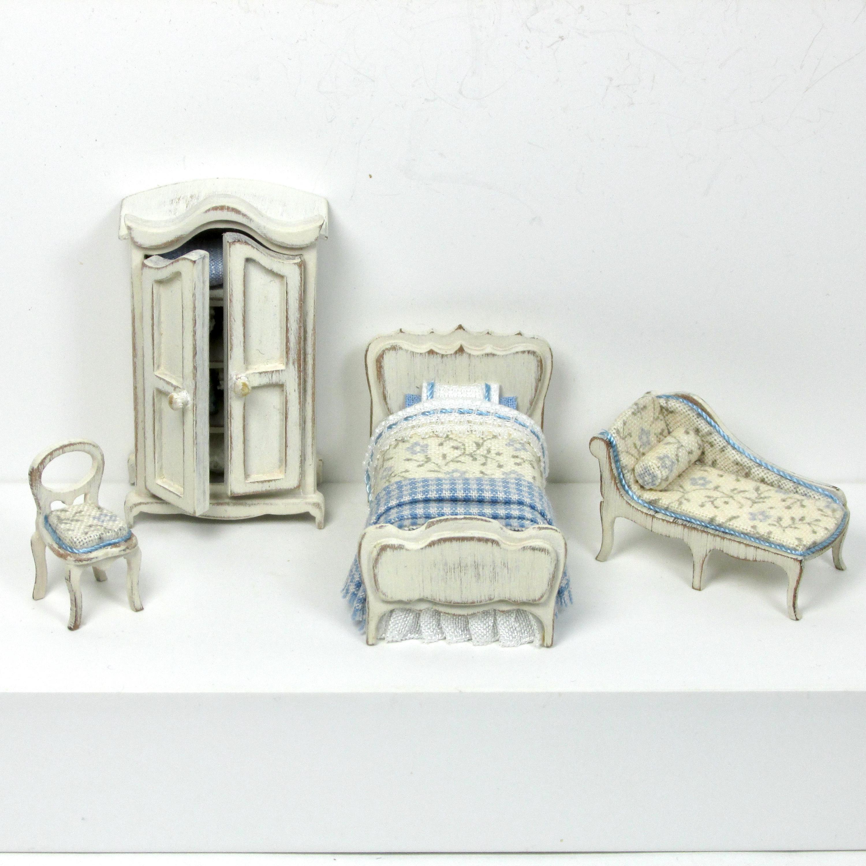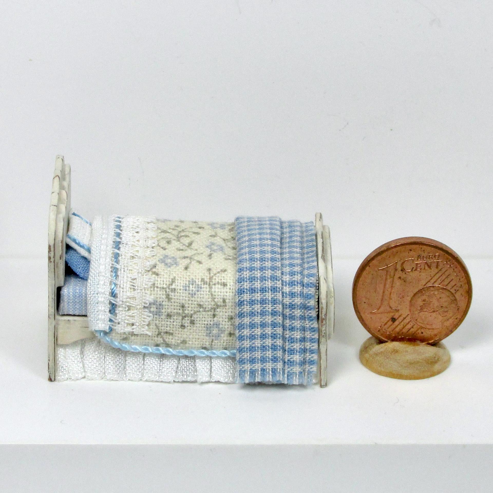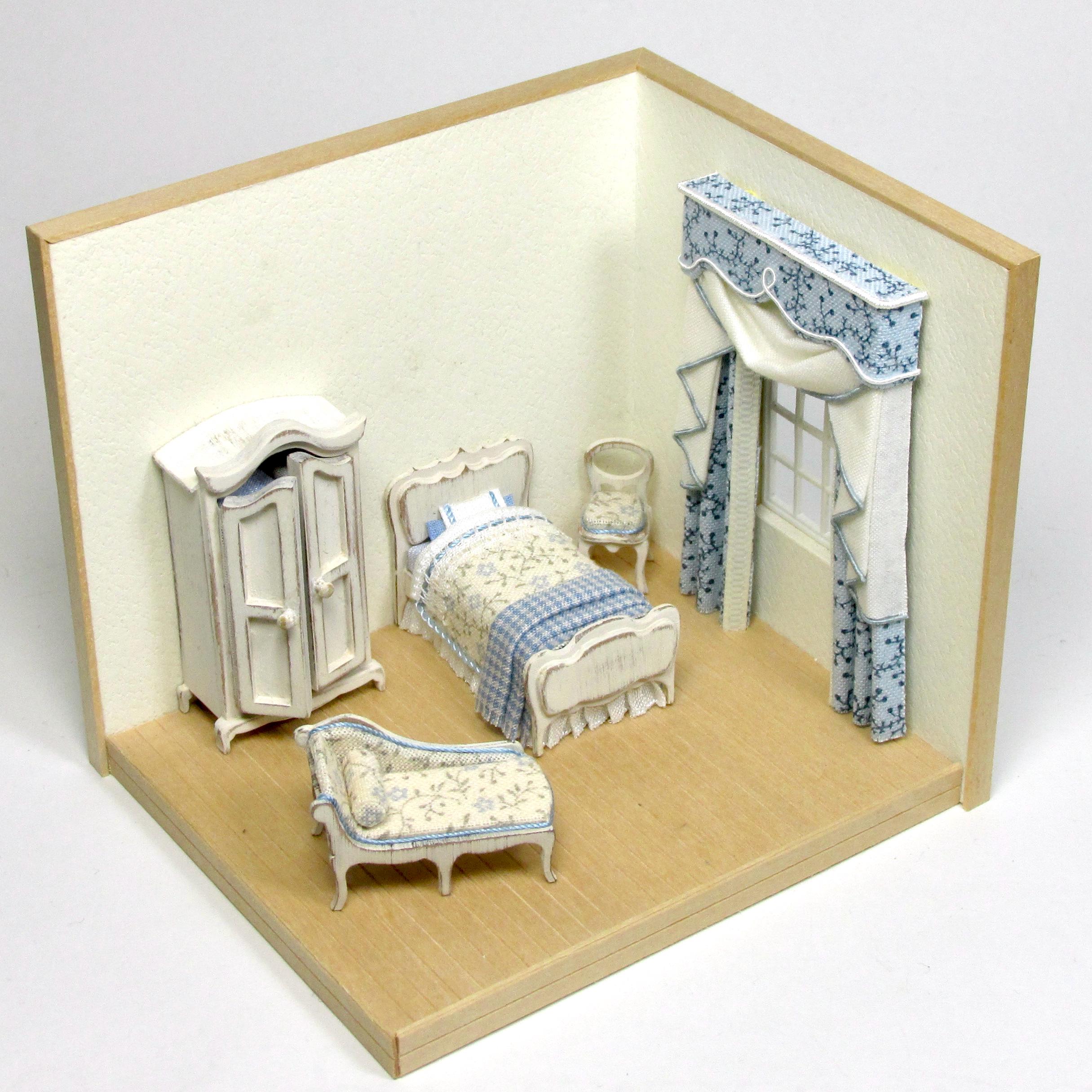 The bed is equipped with blankets, sheets decorated with lace and a plaid folded at the feet. The wardrobe can be opened and contains bed linen, handmade, 1/48 scale