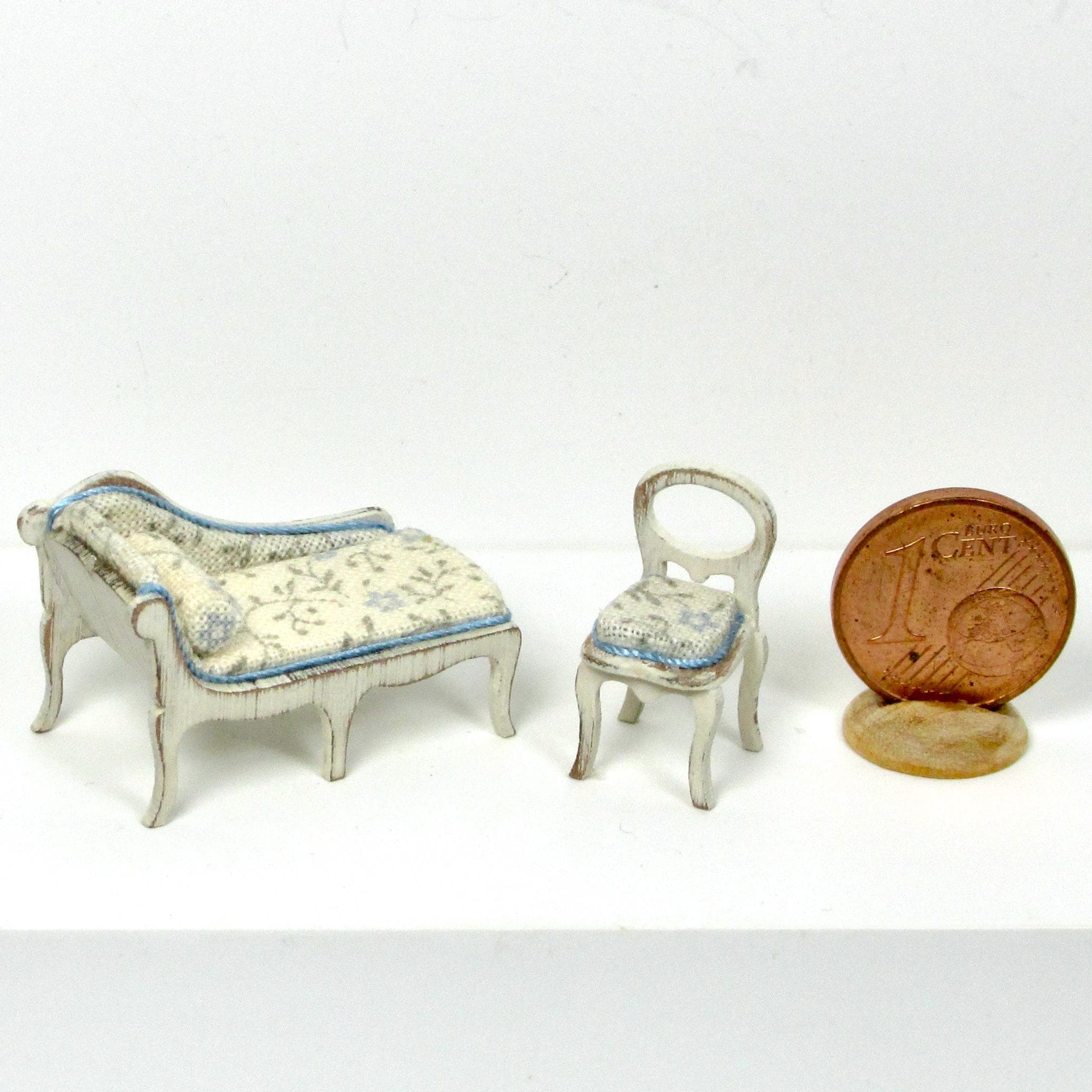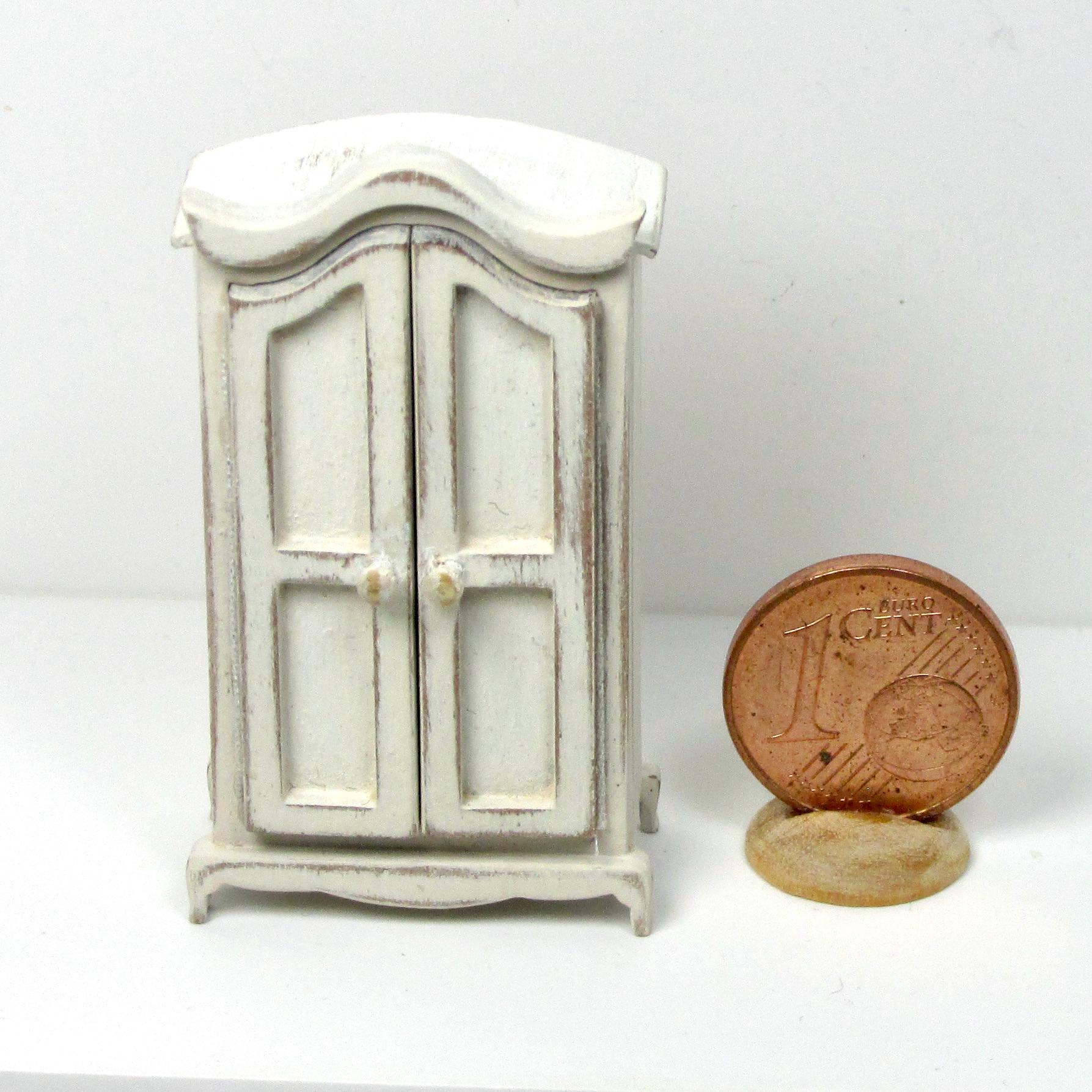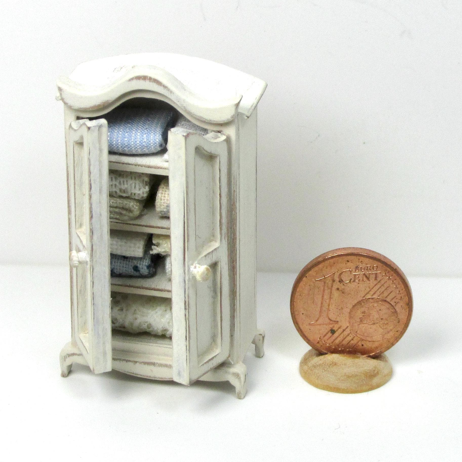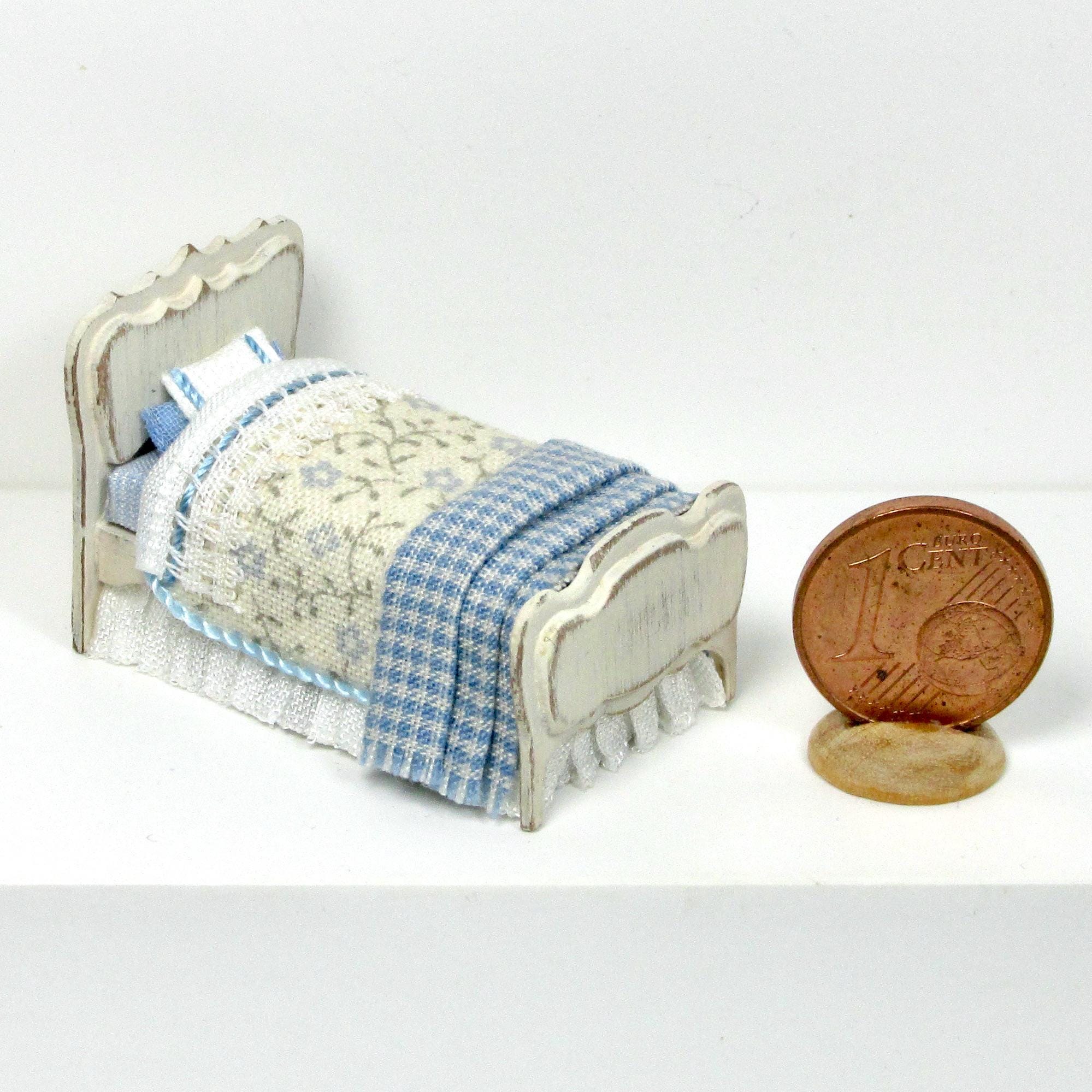 The bed is equipped with blankets, sheets decorated with lace and a plaid folded at the feet. The wardrobe can be opened and contains bed linen, handmade, 1/48 scale