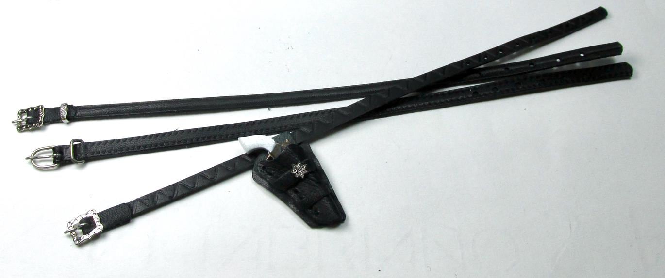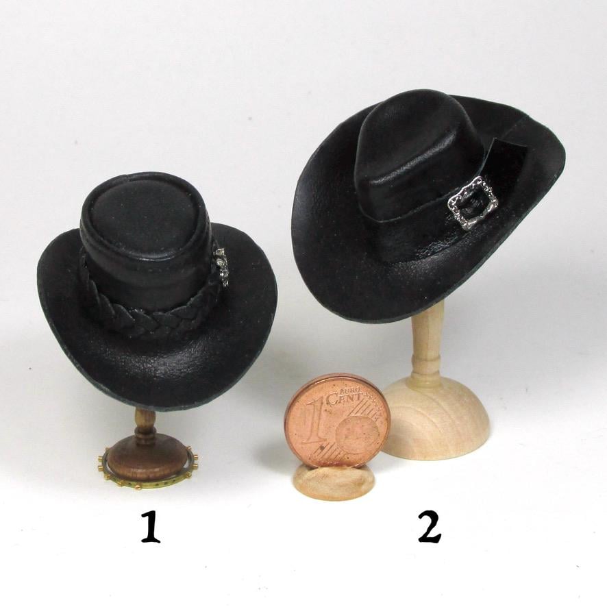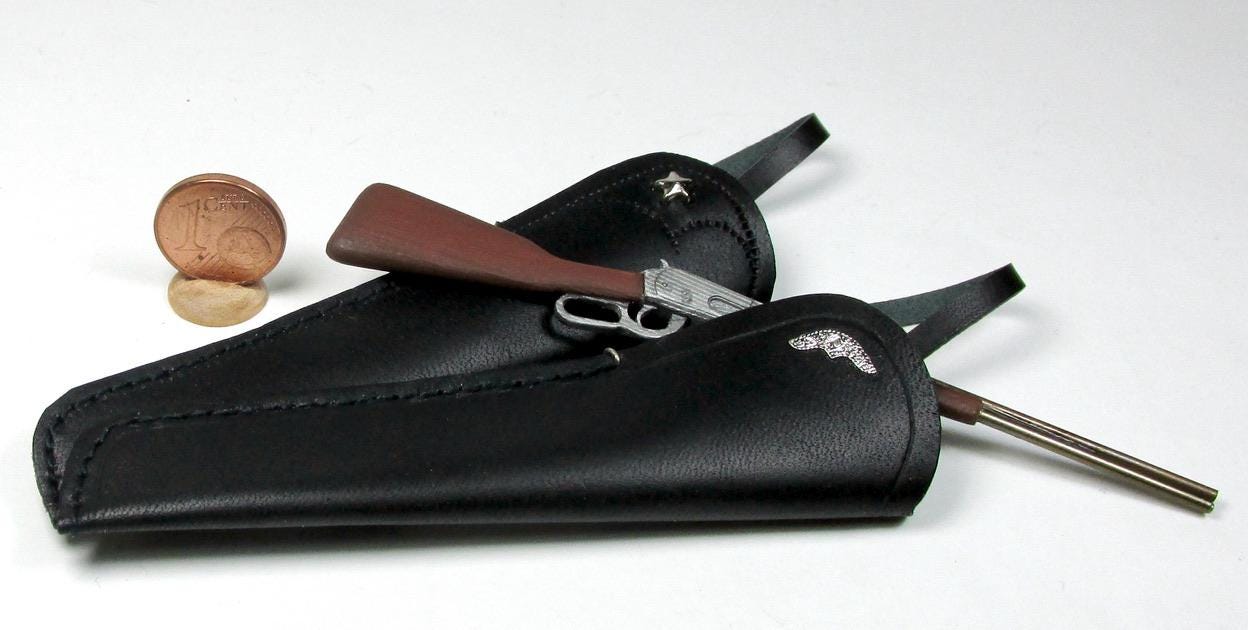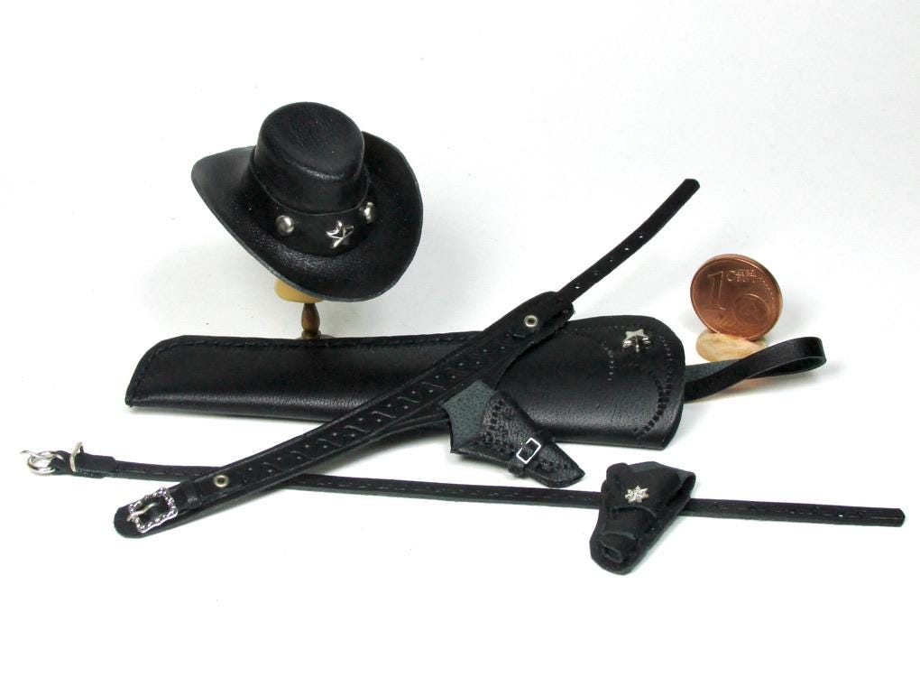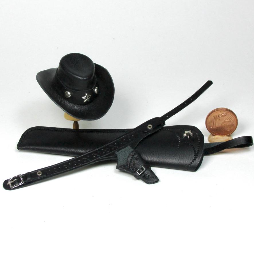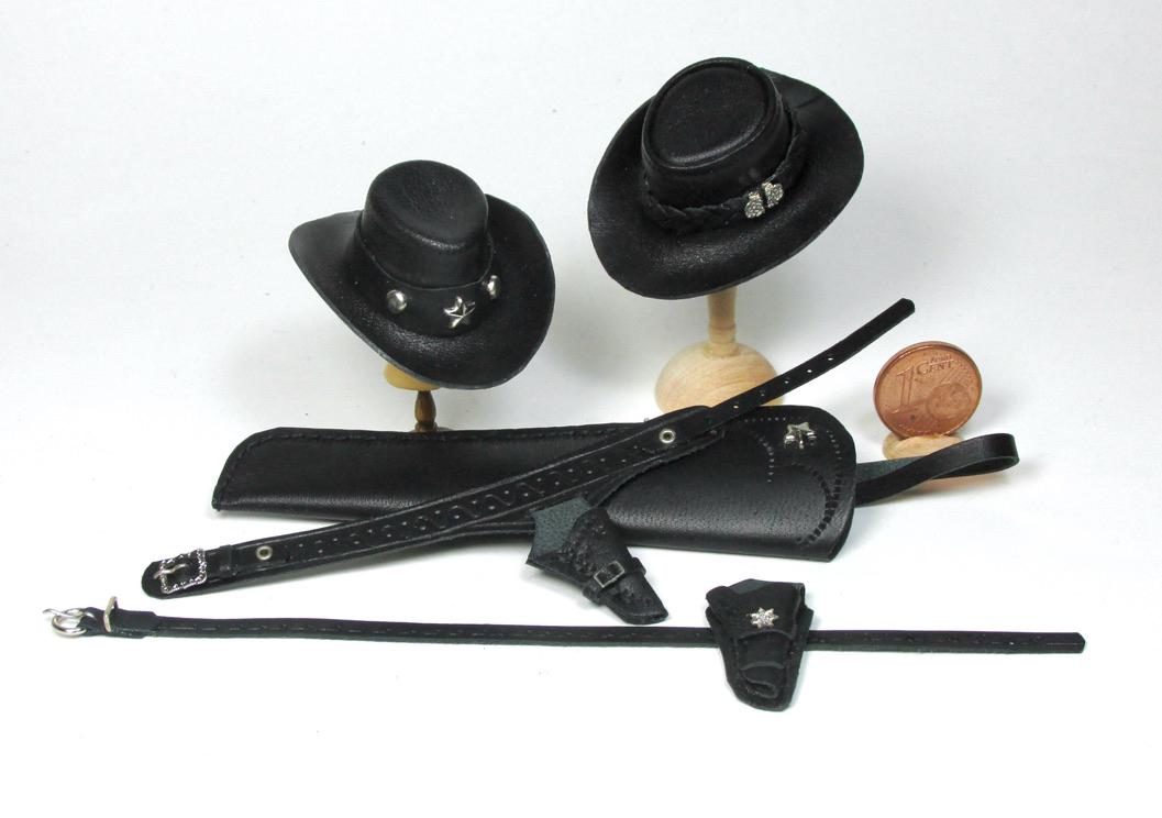 Western clothing items, in perfect cowboy style. Hats, miniature Winchester rifle cases, revolver holsters, and decorated belts are perfect for decorating a corner of a cottage, a souvenir shop, a riding school, a men's living room, or the home of a film buff. The two of embossed leather case, a traditional open model with shoulder strap are carefully finished and hand-sewn, and has a soft suede interior to protect the shotgun. All items are entirely handmade in black leather and perfectly finished in every detail, in 1/12 scale.