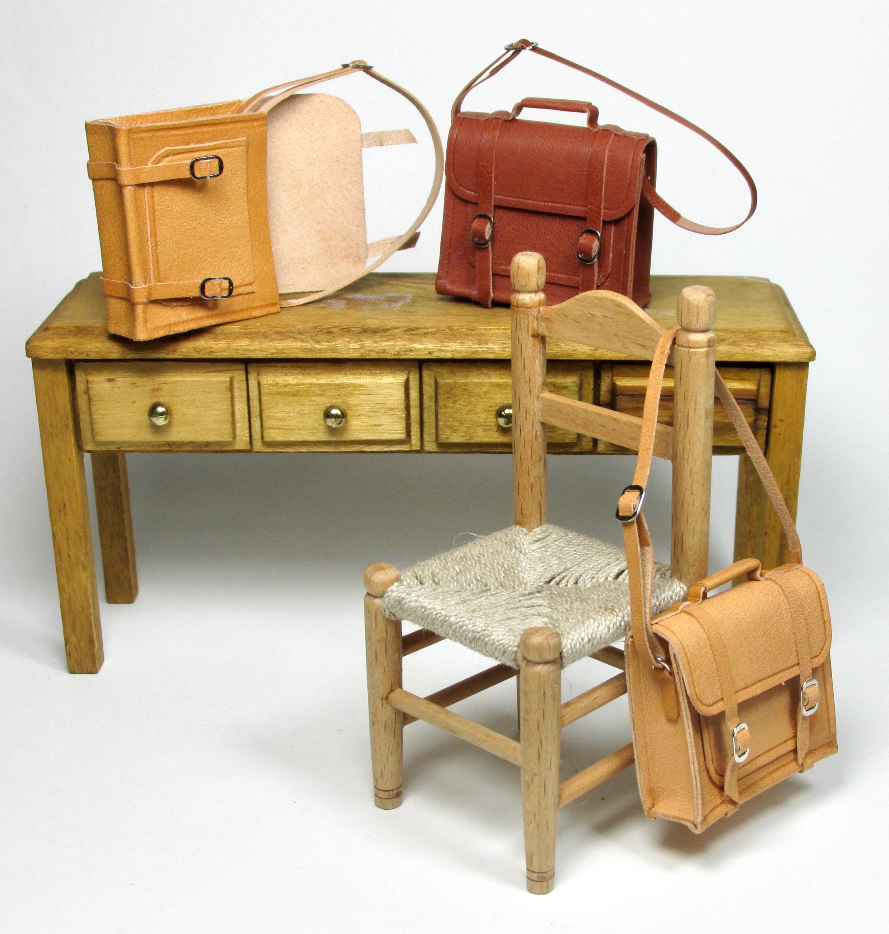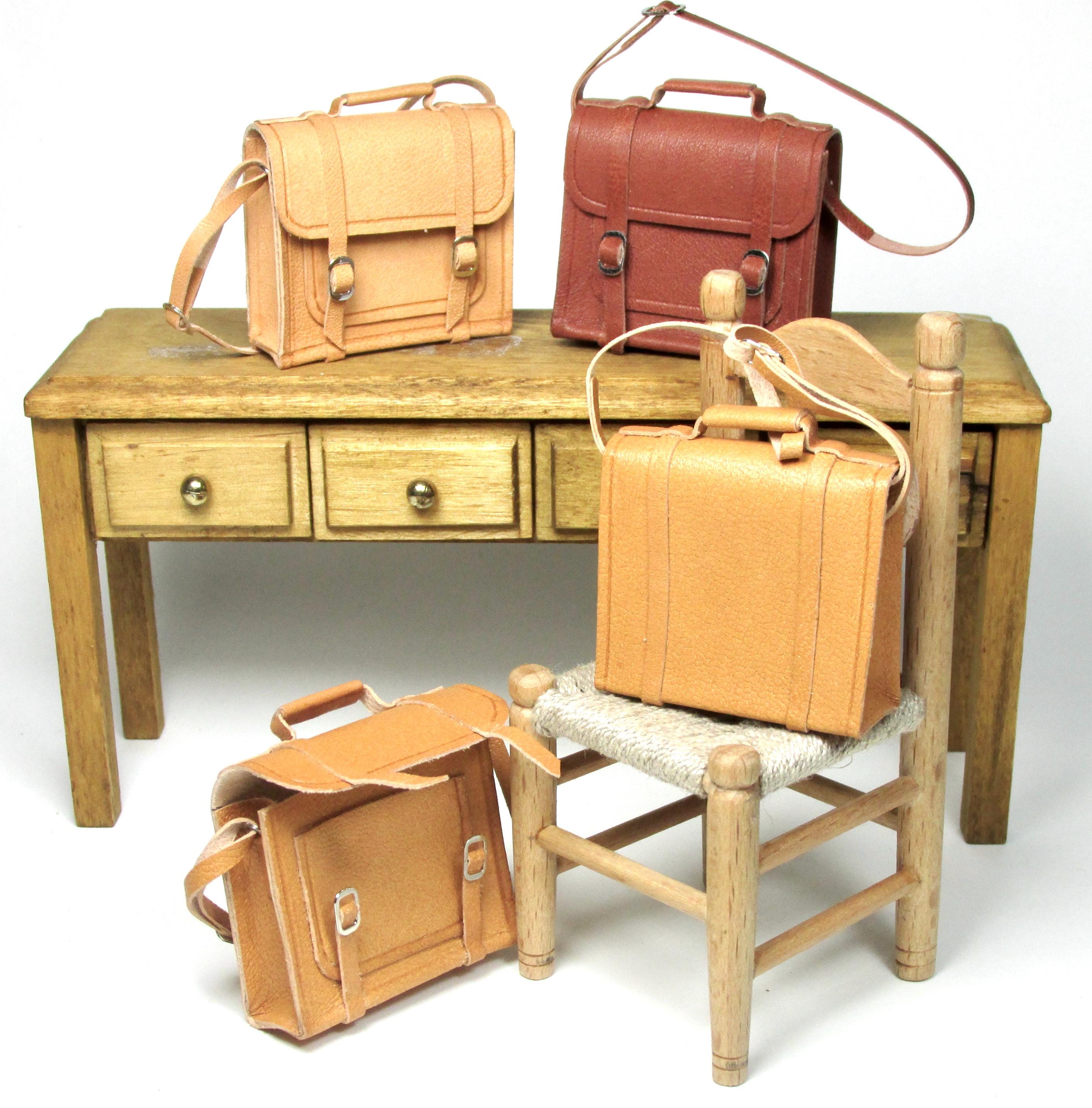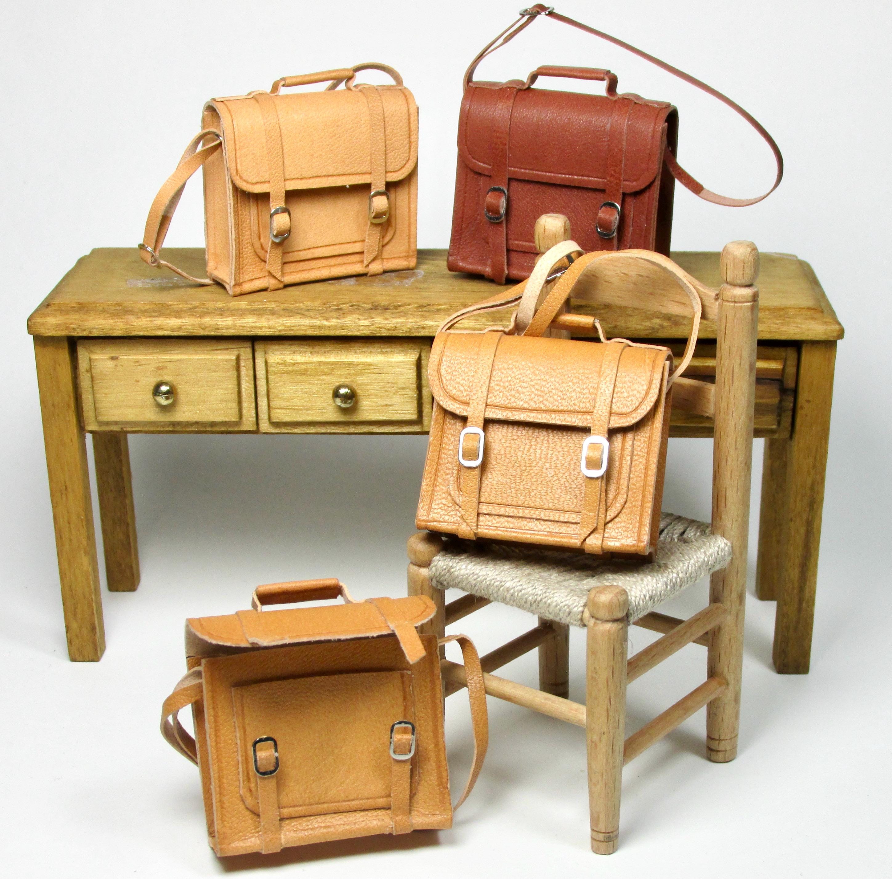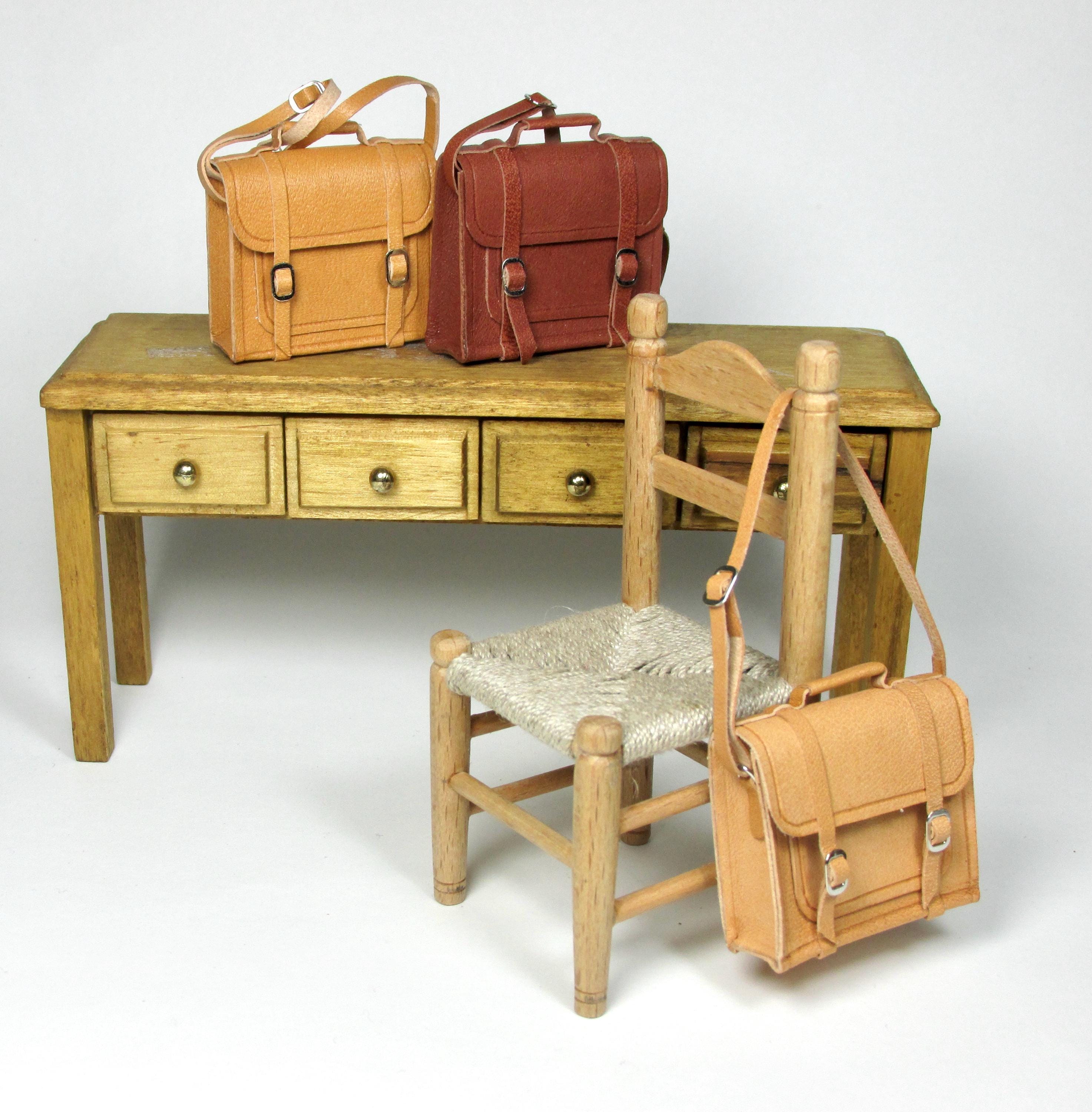 1/12 scale opening leather briefcase, made entirely by hand with naturally tanned leather, which can be opened via two closing buckles. Available in three colors, it's perfect for a man's study, a child's bedroom, or a front door. The length of the shoulder strap is adjustable with a sliding buckle.