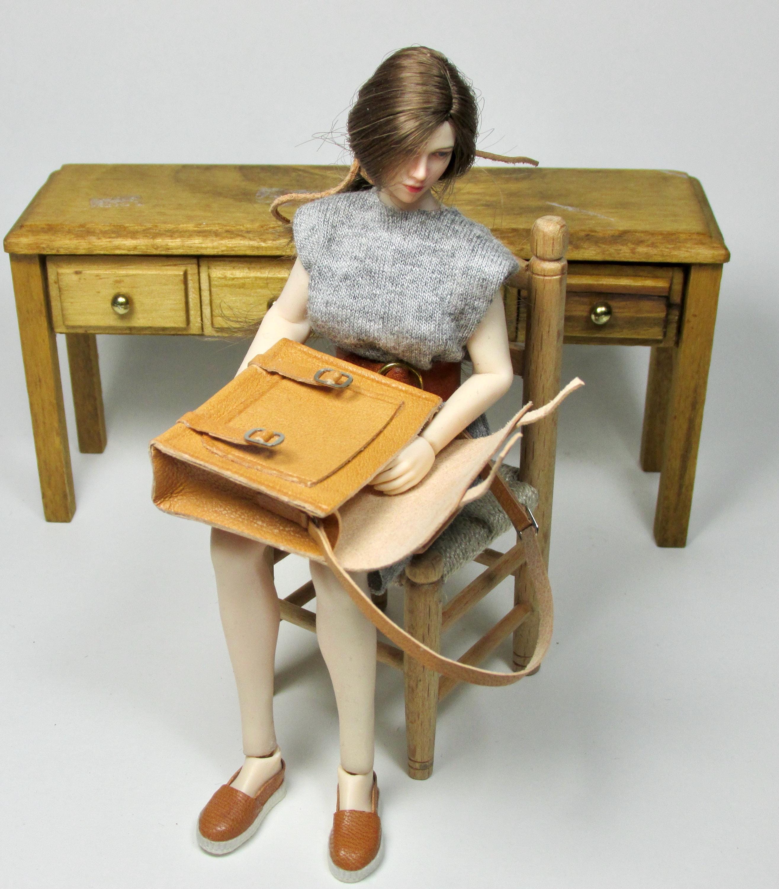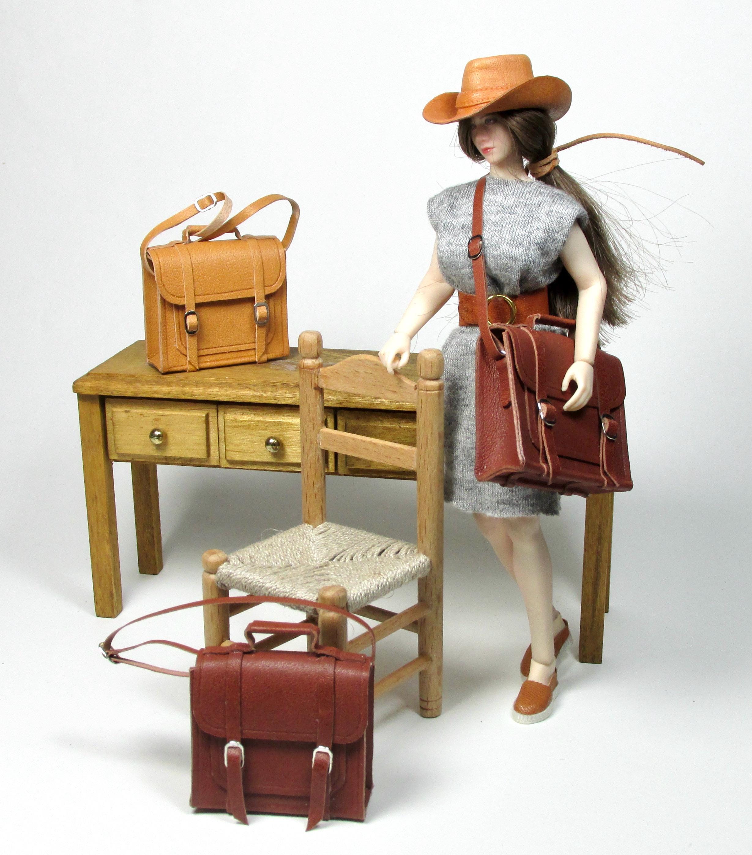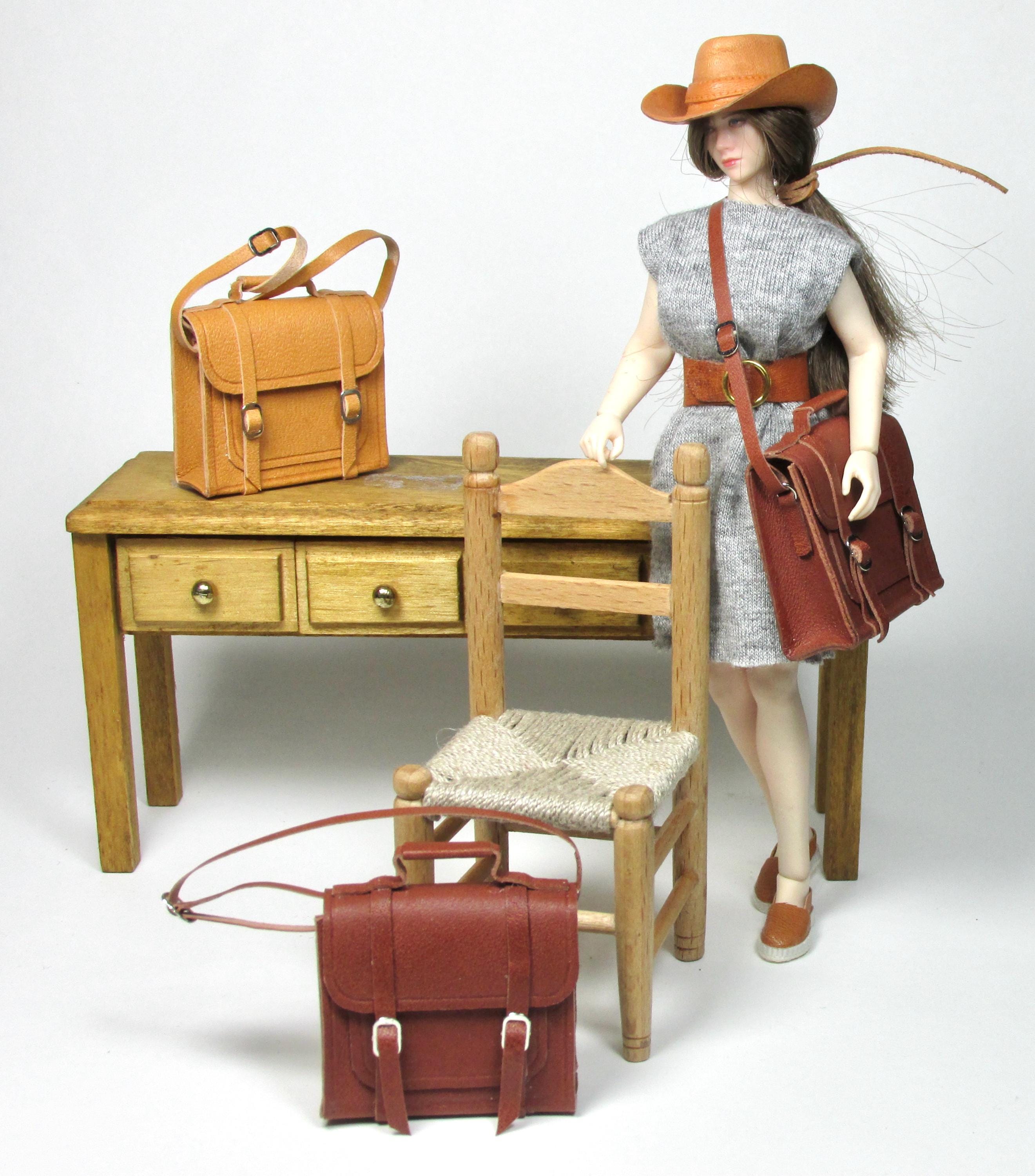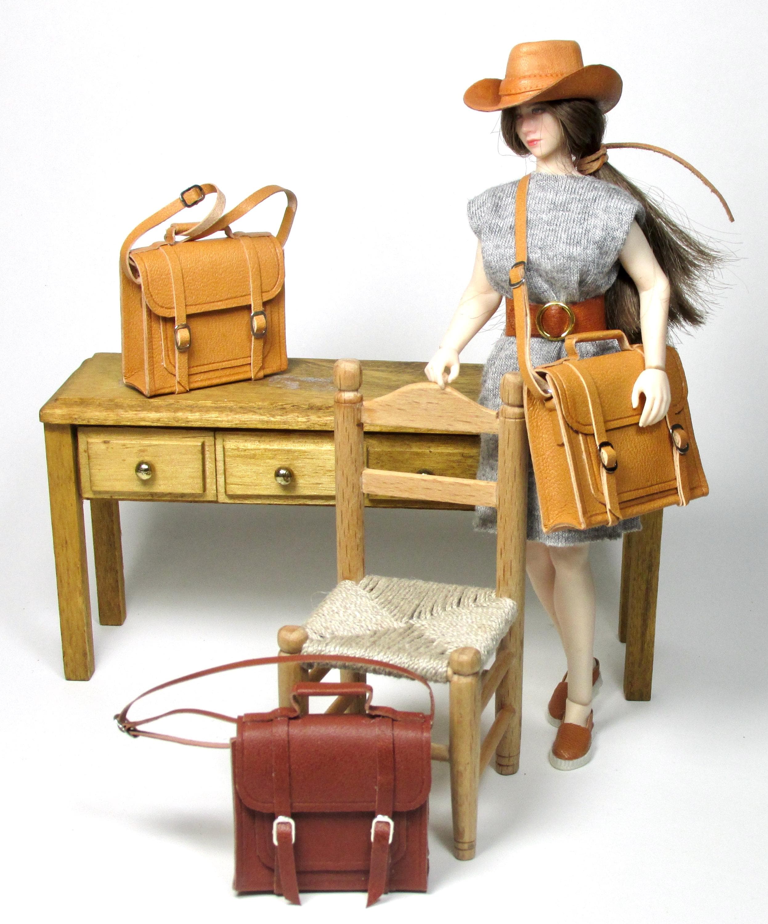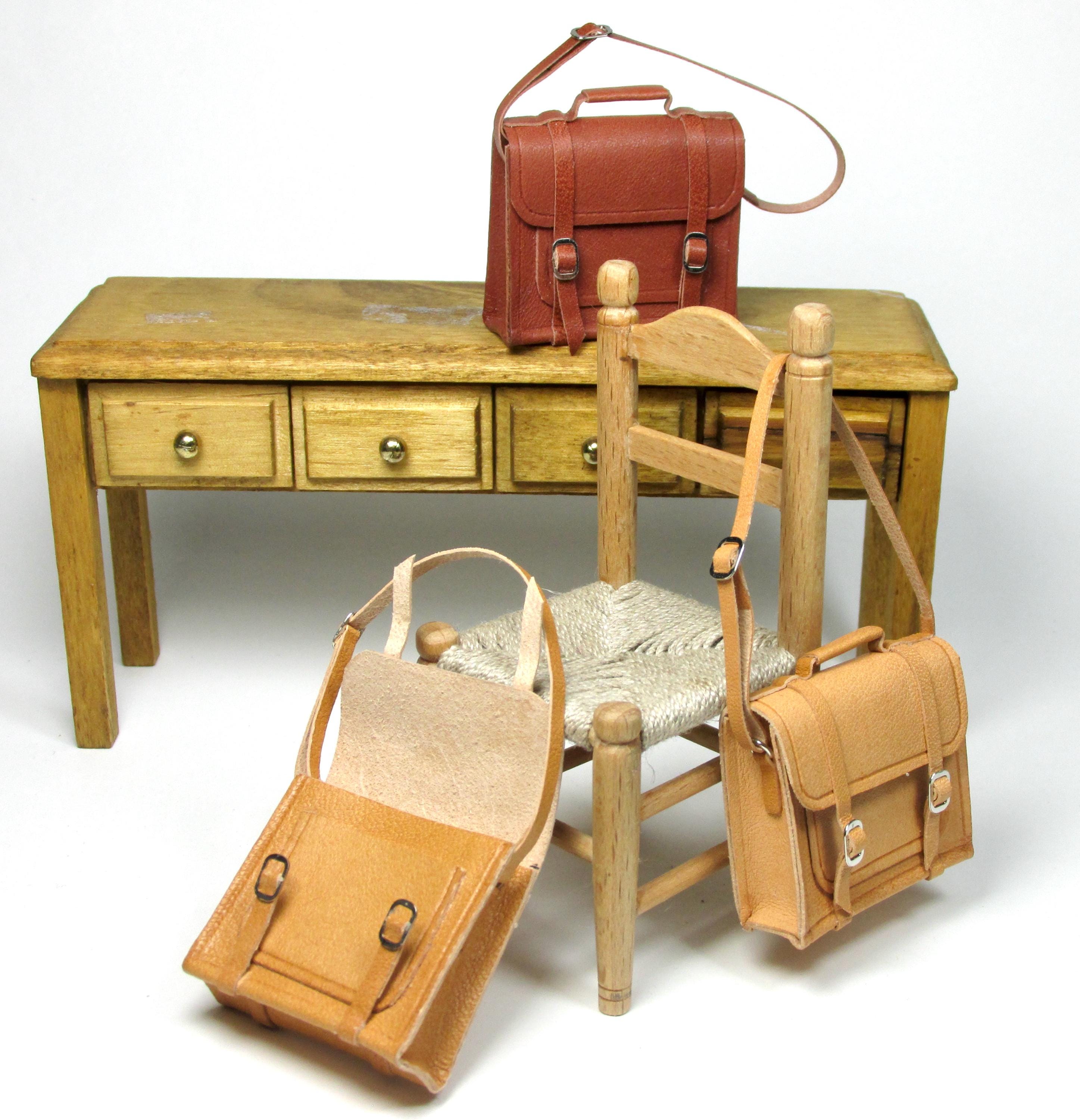 1/12 scale opening leather briefcase, made entirely by hand with naturally tanned leather, which can be opened via two closing buckles. Available in three colors, it's perfect for a man's study, a child's bedroom, or a front door. The length of the shoulder strap is adjustable with a sliding buckle.