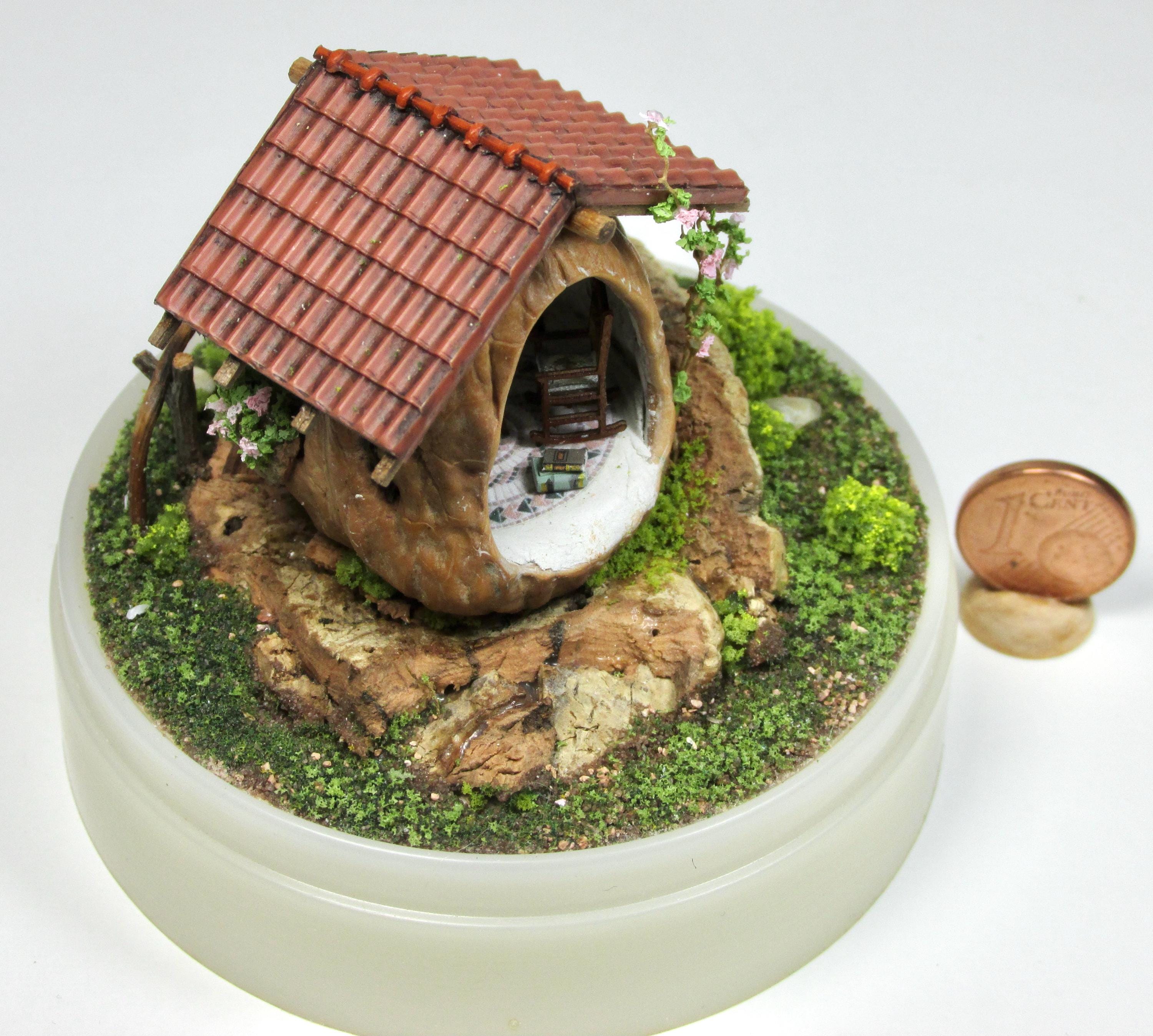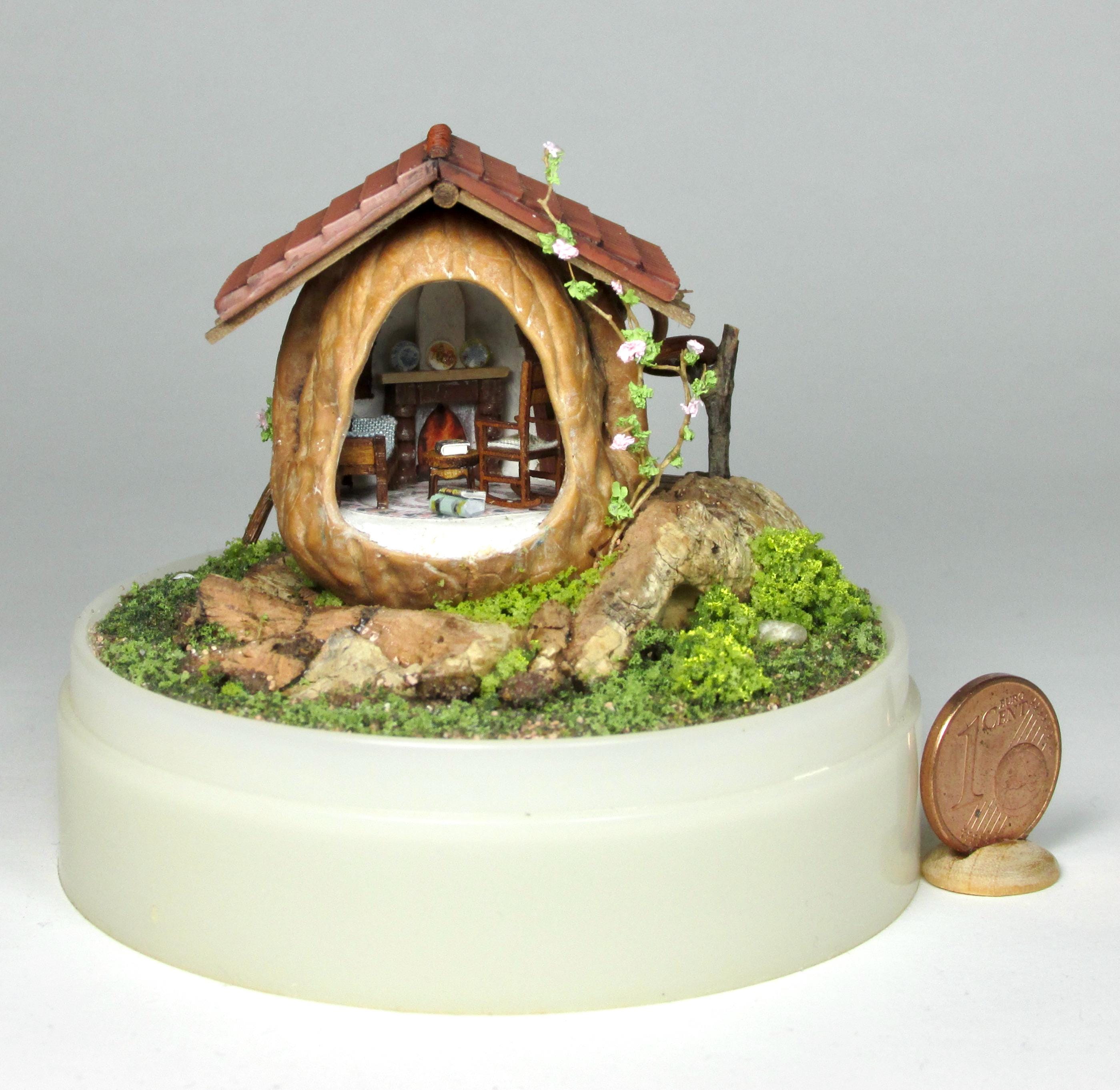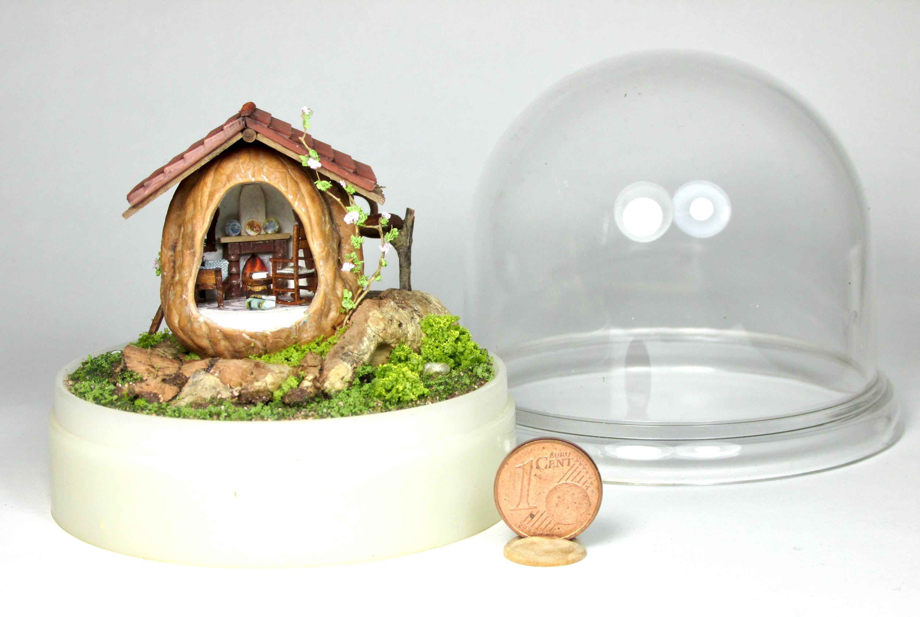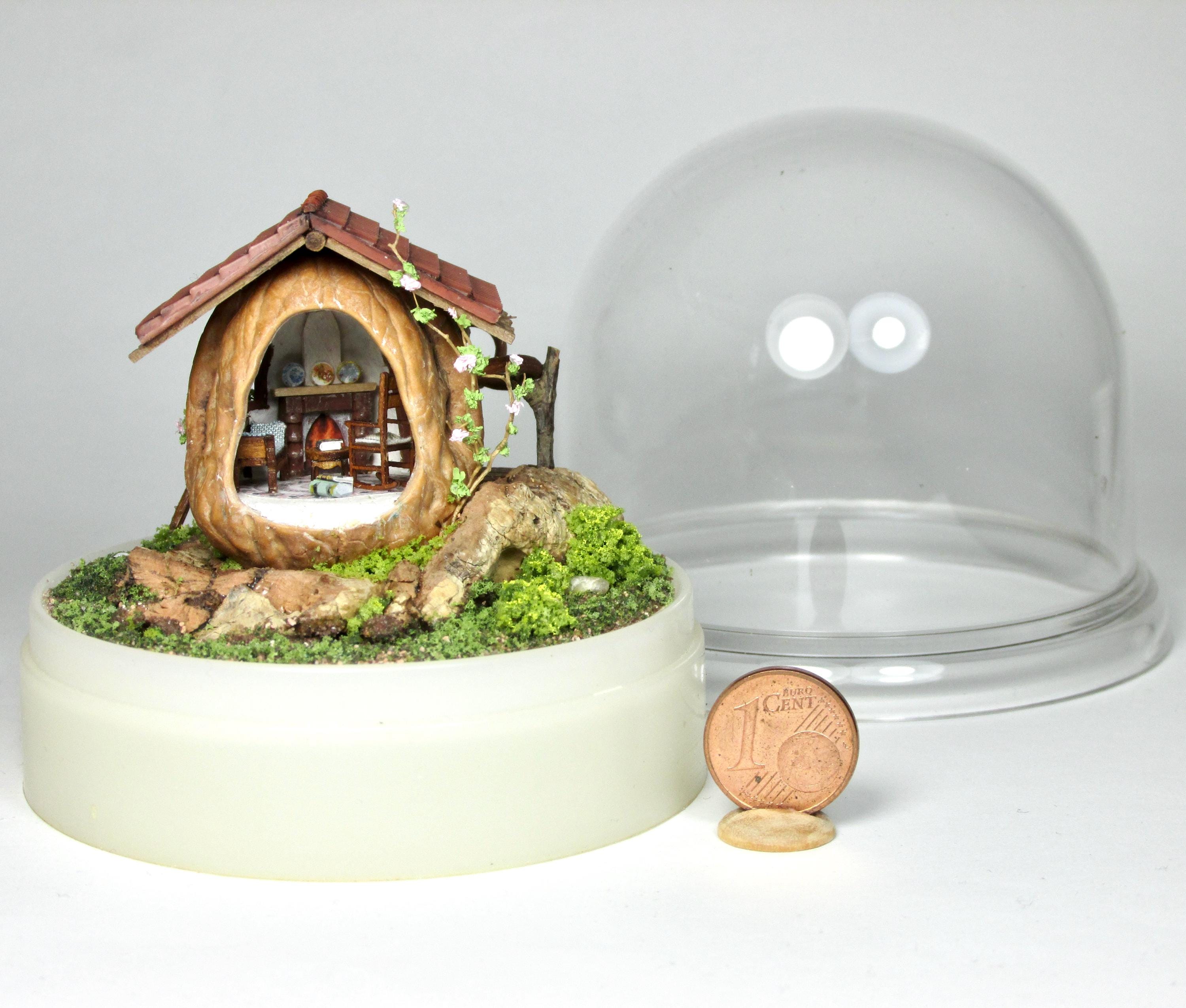 When I found these beautiful walnuts, I couldn't resist hollowing them out to create a home for little creatures: fairies, perhaps? The work is time-consuming, but the result is very decorative! So here's a cozy living room with a fireplace, a sofa and rocking chair, a coffee table with books, and, outside, greenery and flowers, all in 1/144 scale. Made from natural materials—wood, foam, cork, vine leaves—the mini landscape is protected from dust by an acrylic dome, but if you want to remove it, you'll need to remove the screw at the base.