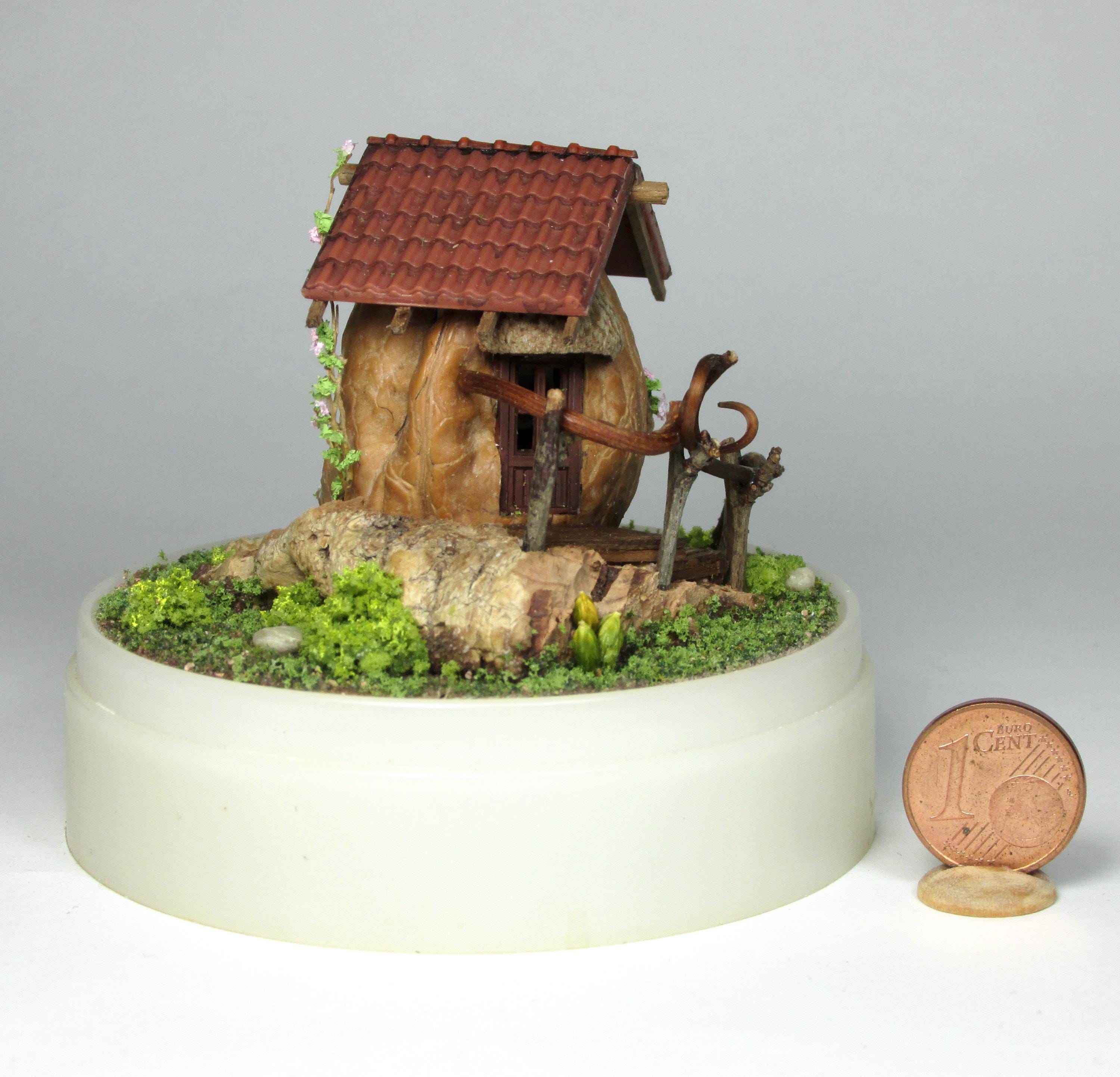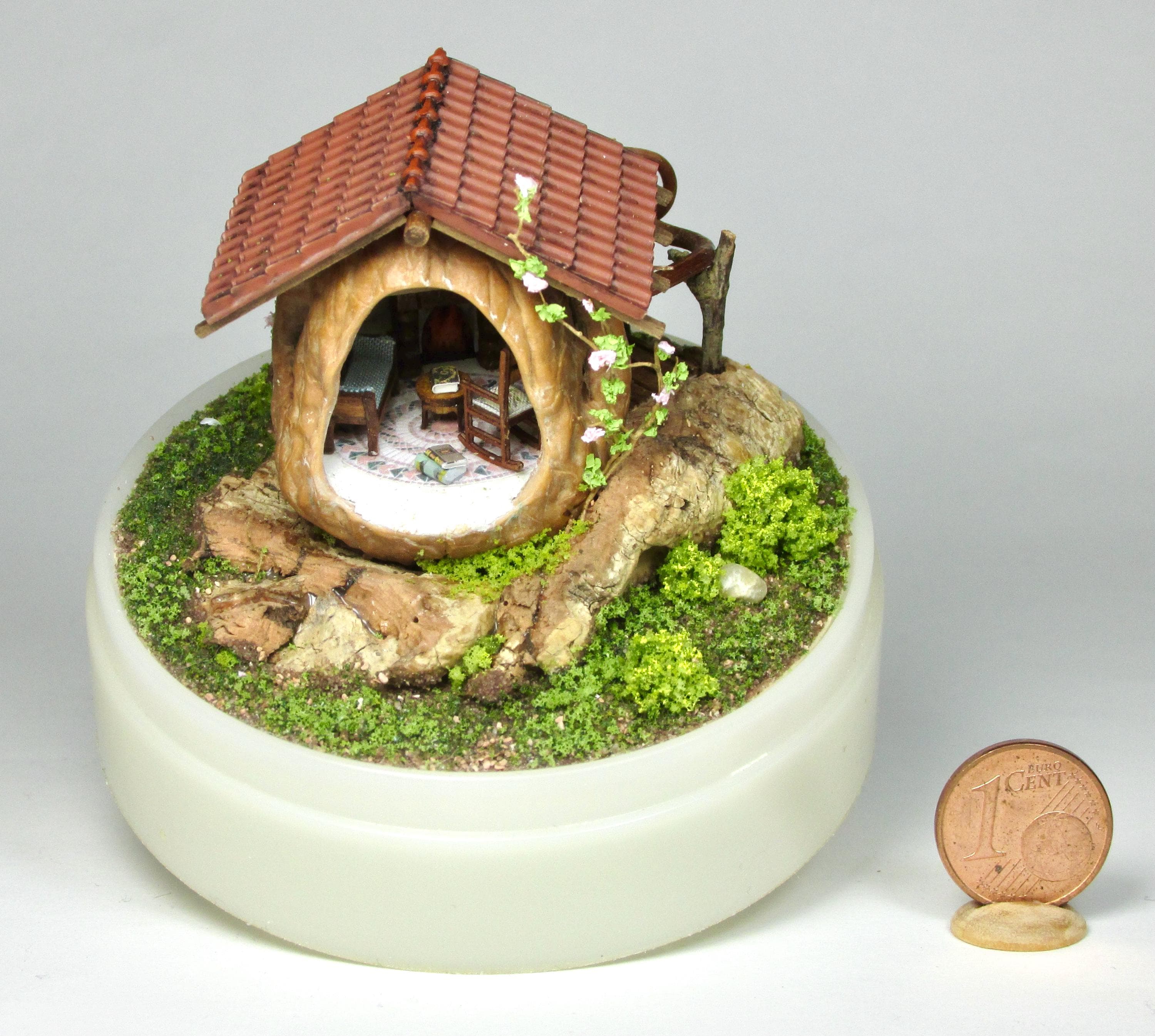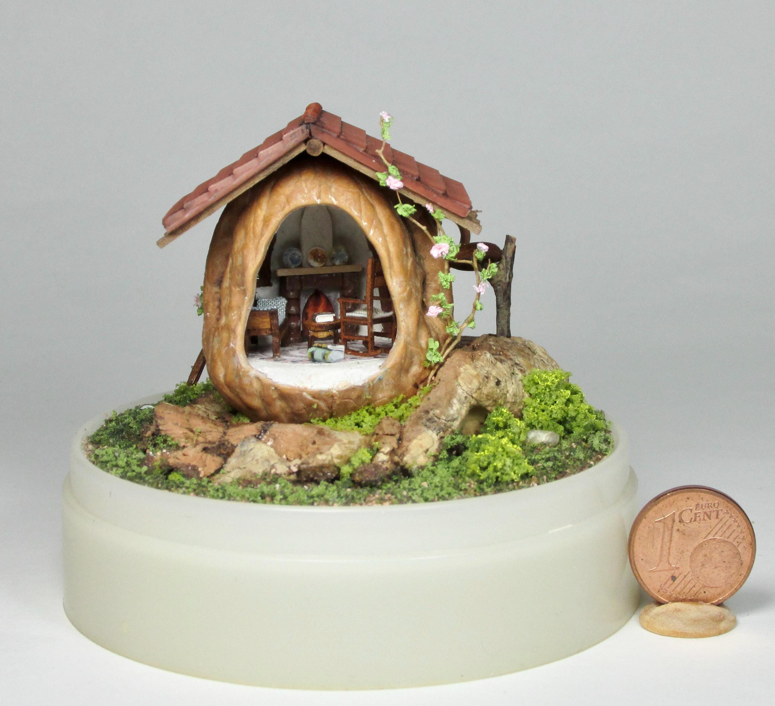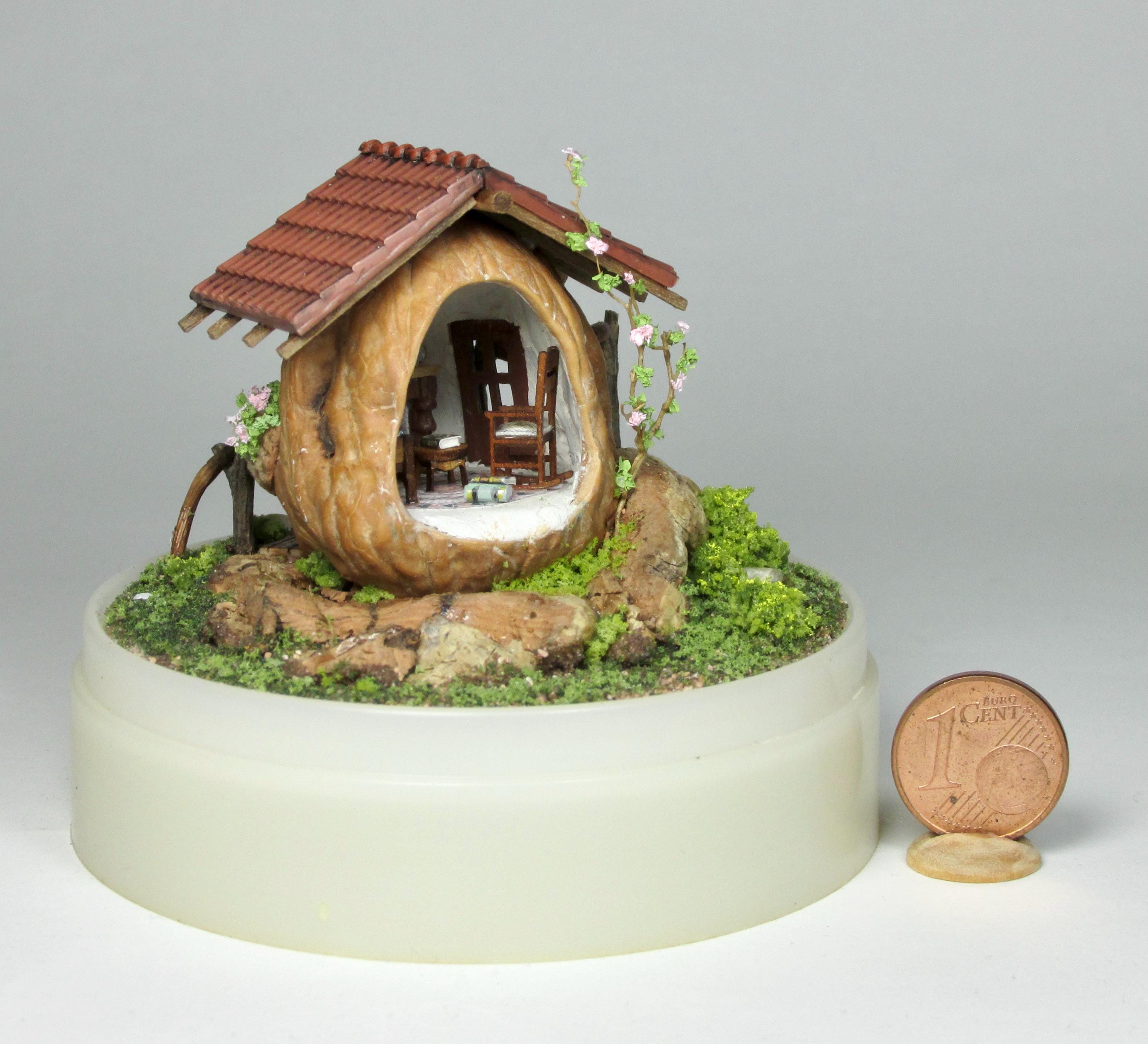 When I found these beautiful walnuts, I couldn't resist hollowing them out to create a home for little creatures: fairies, perhaps? The work is time-consuming, but the result is very decorative! So here's a cozy living room with a fireplace, a sofa and rocking chair, a coffee table with books, and, outside, greenery and flowers, all in 1/144 scale. Made from natural materials—wood, foam, cork, vine leaves—the mini landscape is protected from dust by an acrylic dome, but if you want to remove it, you'll need to remove the screw at the base.