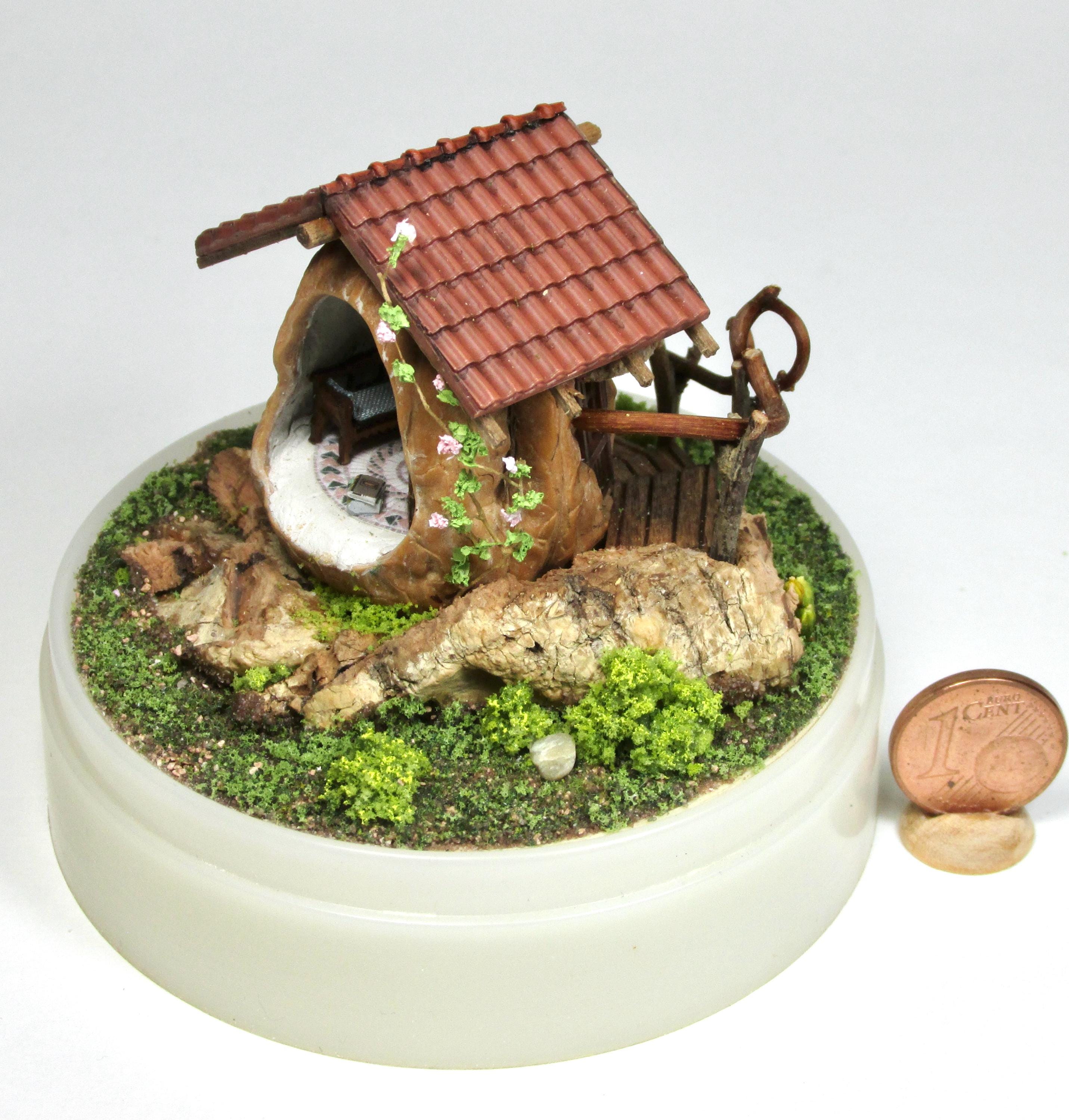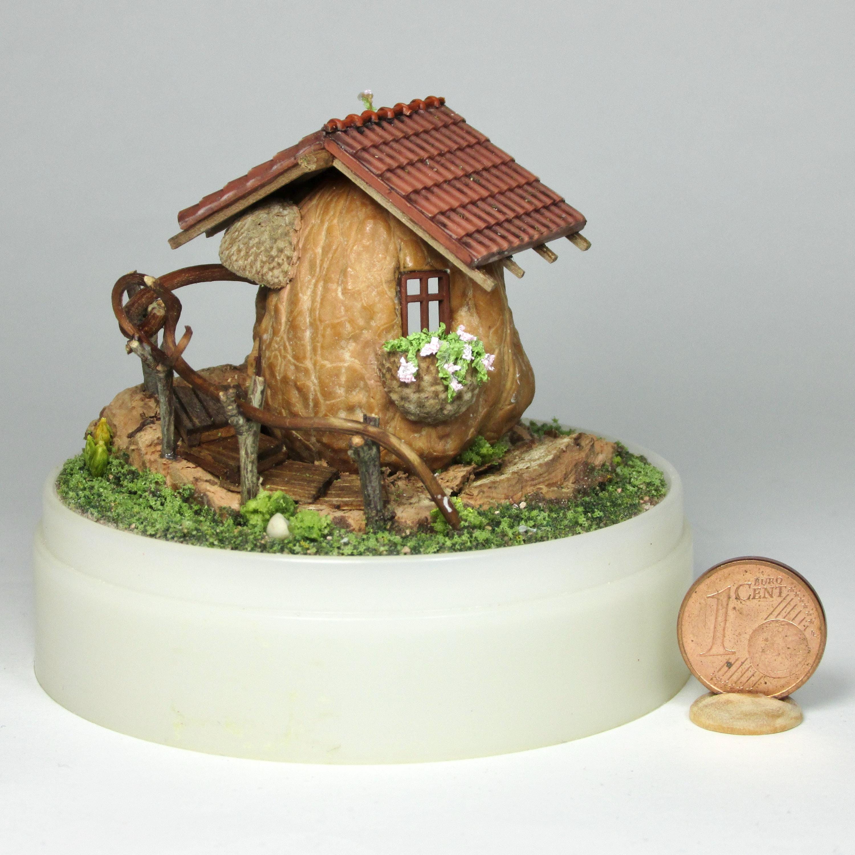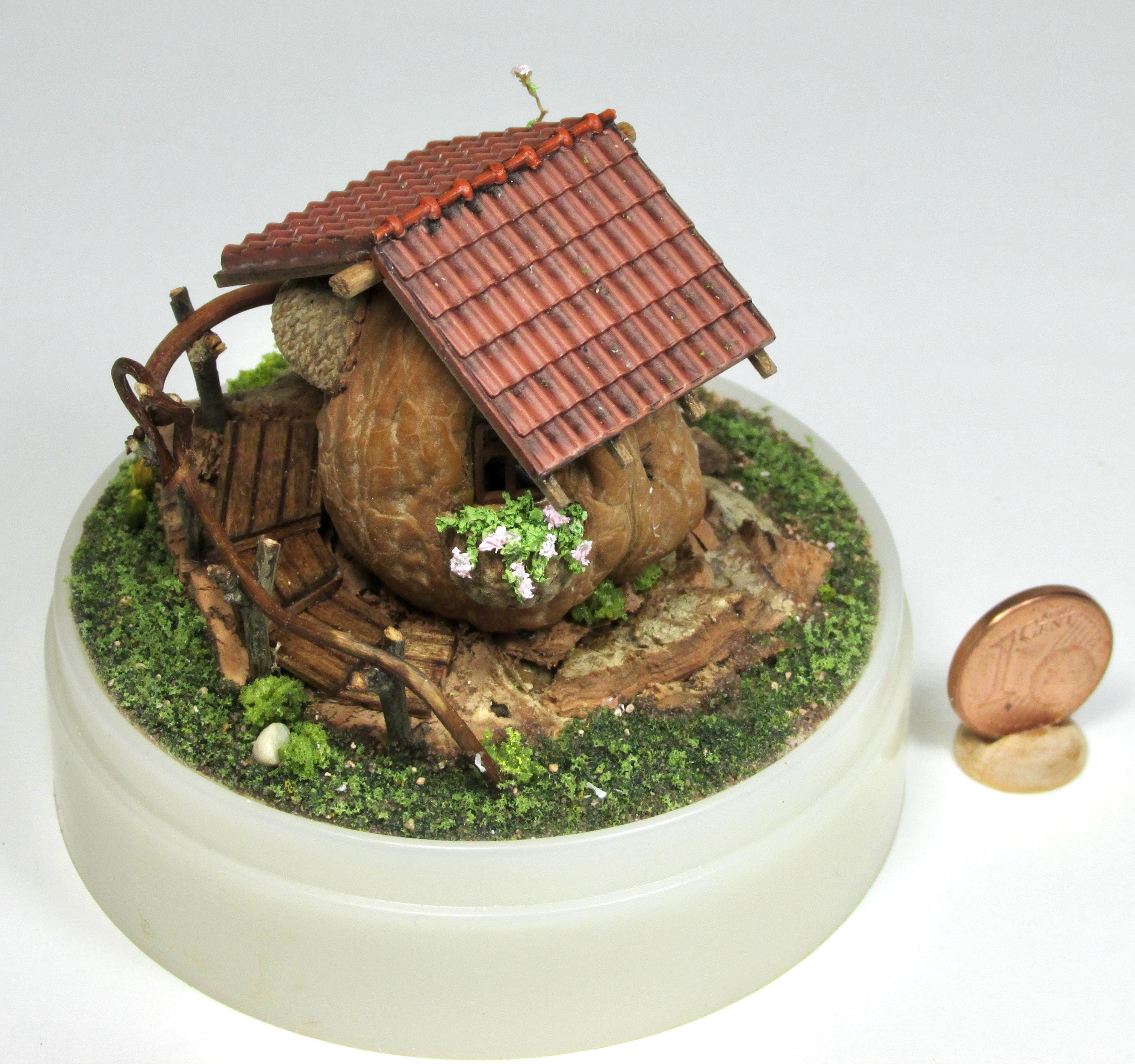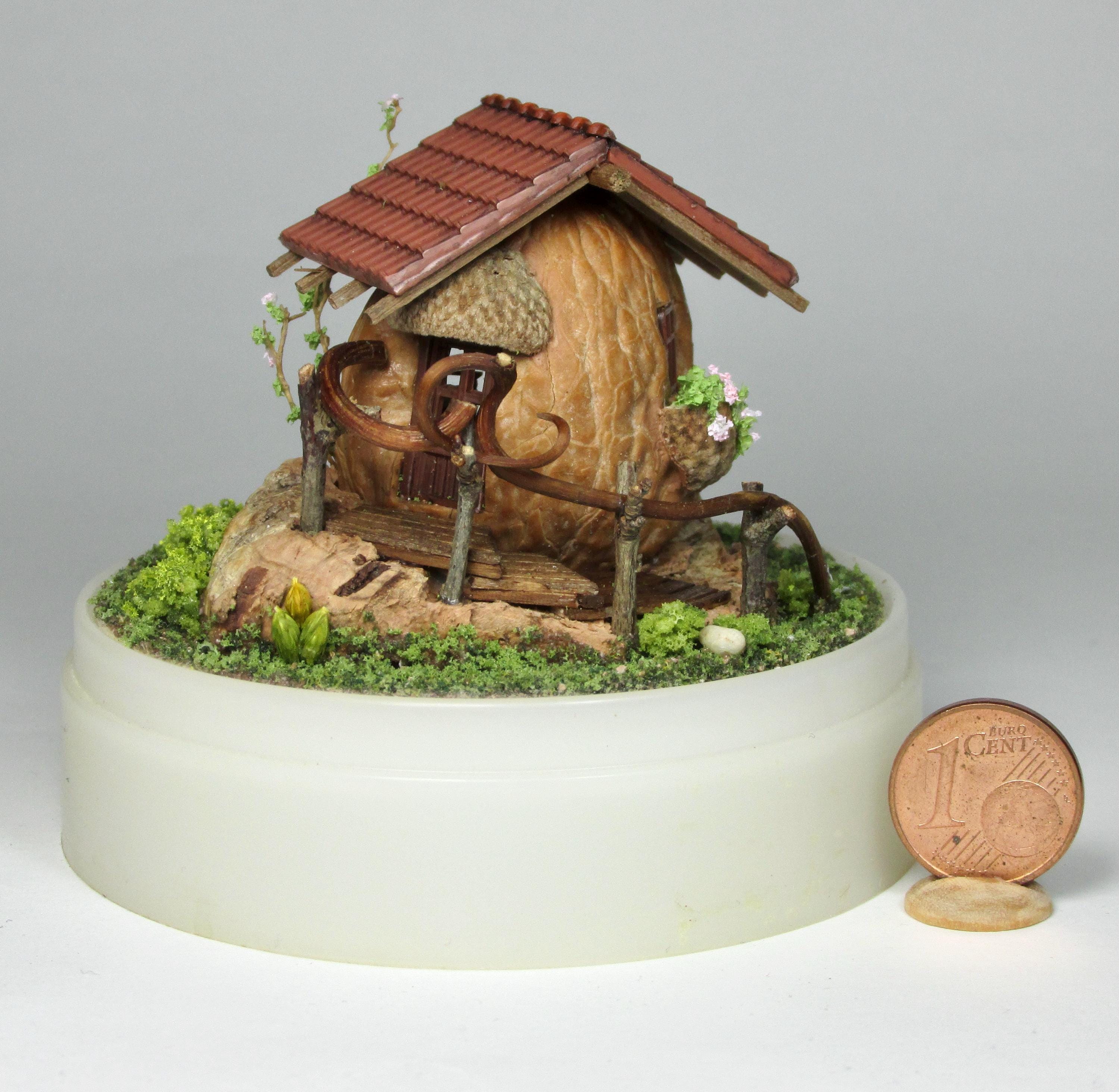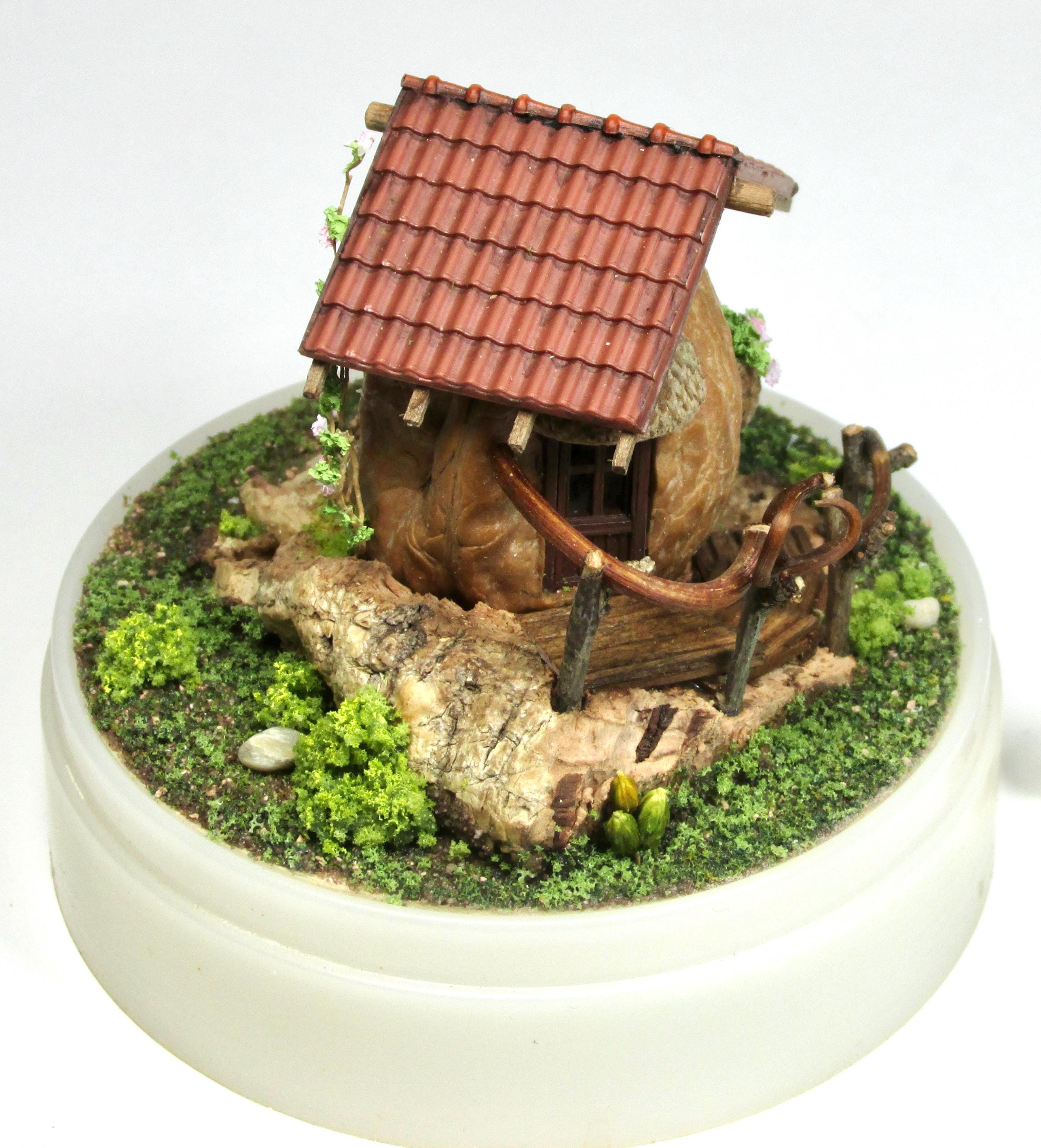 When I found these beautiful walnuts, I couldn't resist hollowing them out to create a home for little creatures: fairies, perhaps? The work is time-consuming, but the result is very decorative! So here's a cozy living room with a fireplace, a sofa and rocking chair, a coffee table with books, and, outside, greenery and flowers, all in 1/144 scale. Made from natural materials—wood, foam, cork, vine leaves—the mini landscape is protected from dust by an acrylic dome, but if you want to remove it, you'll need to remove the screw at the base.