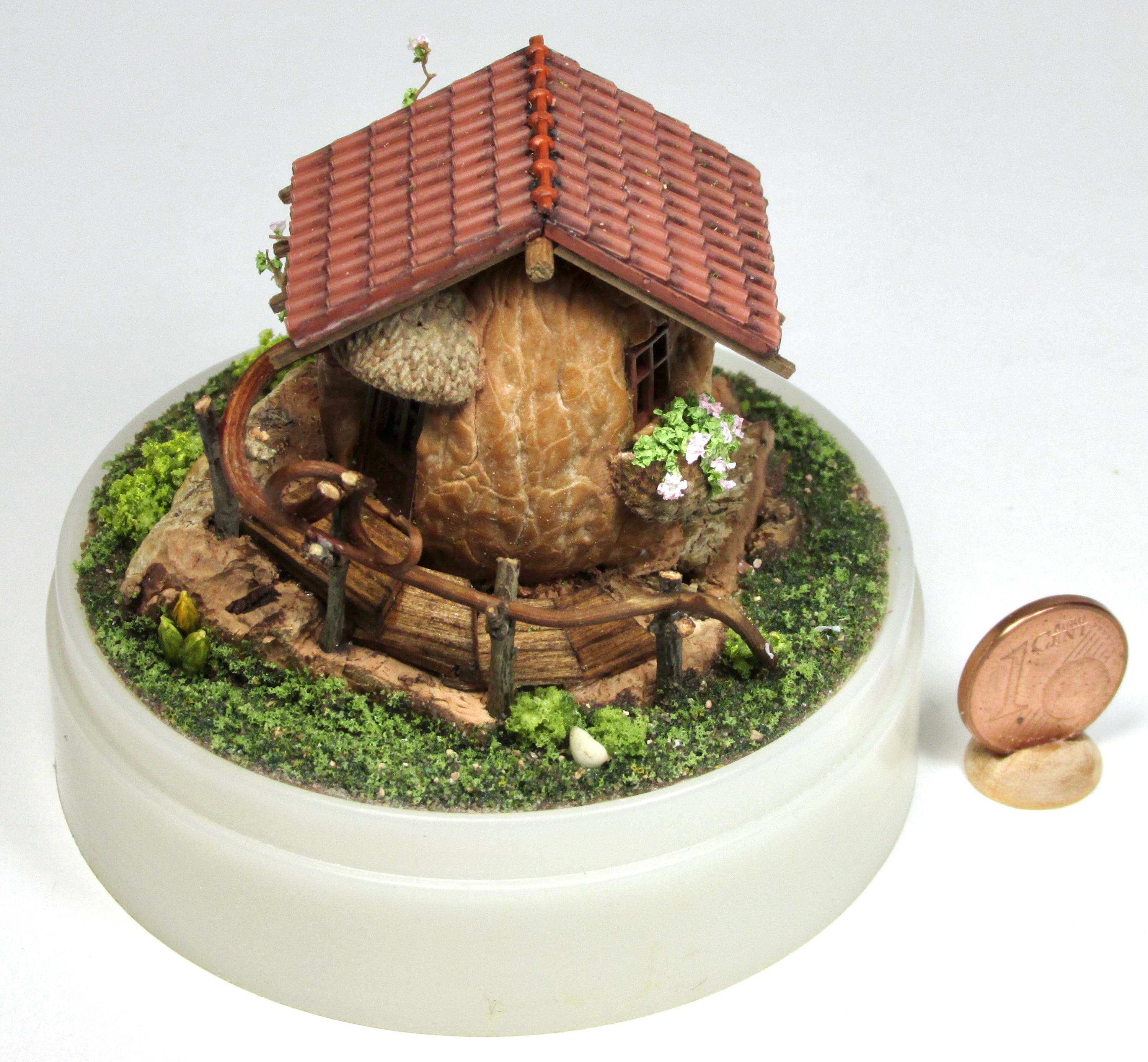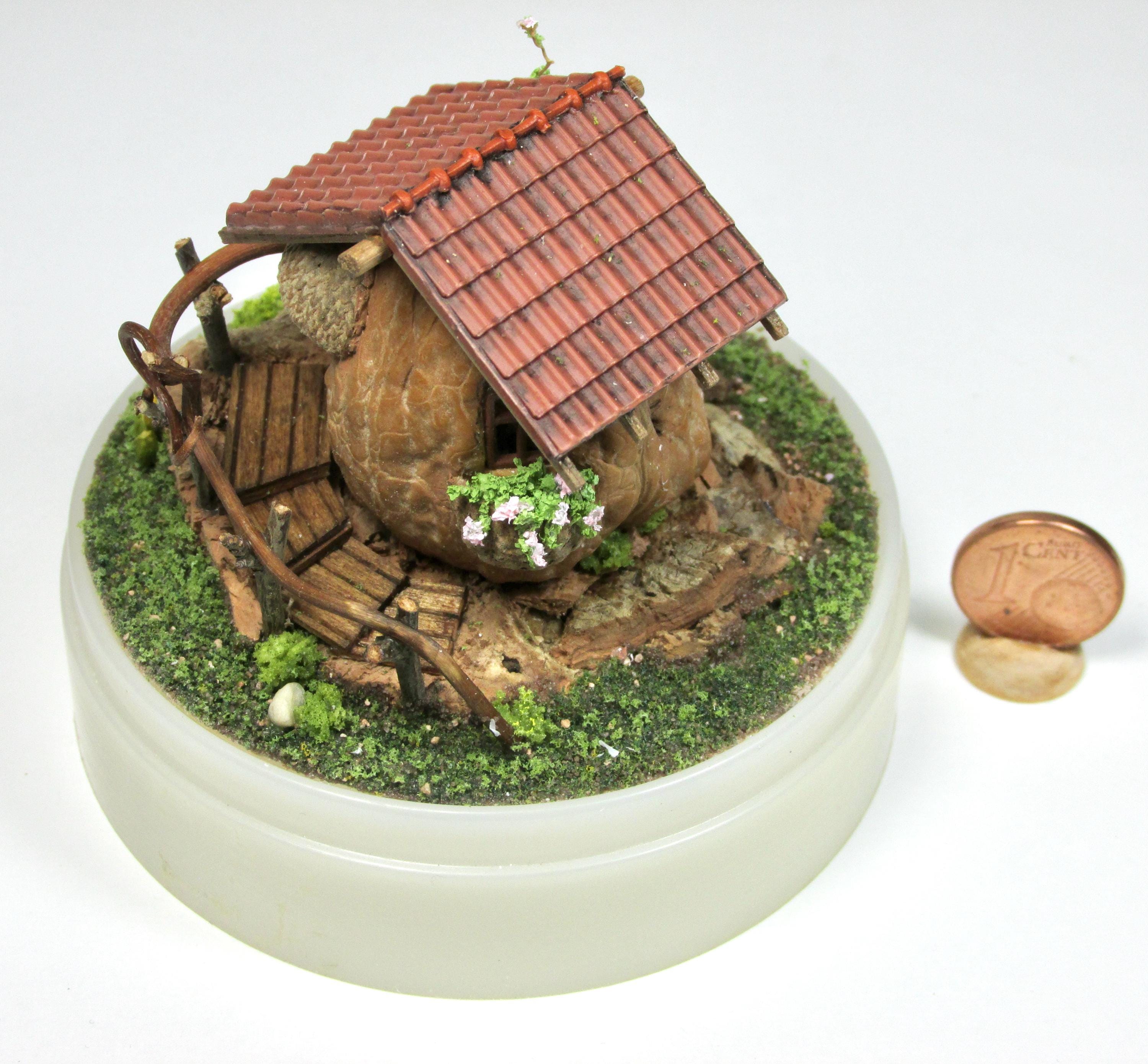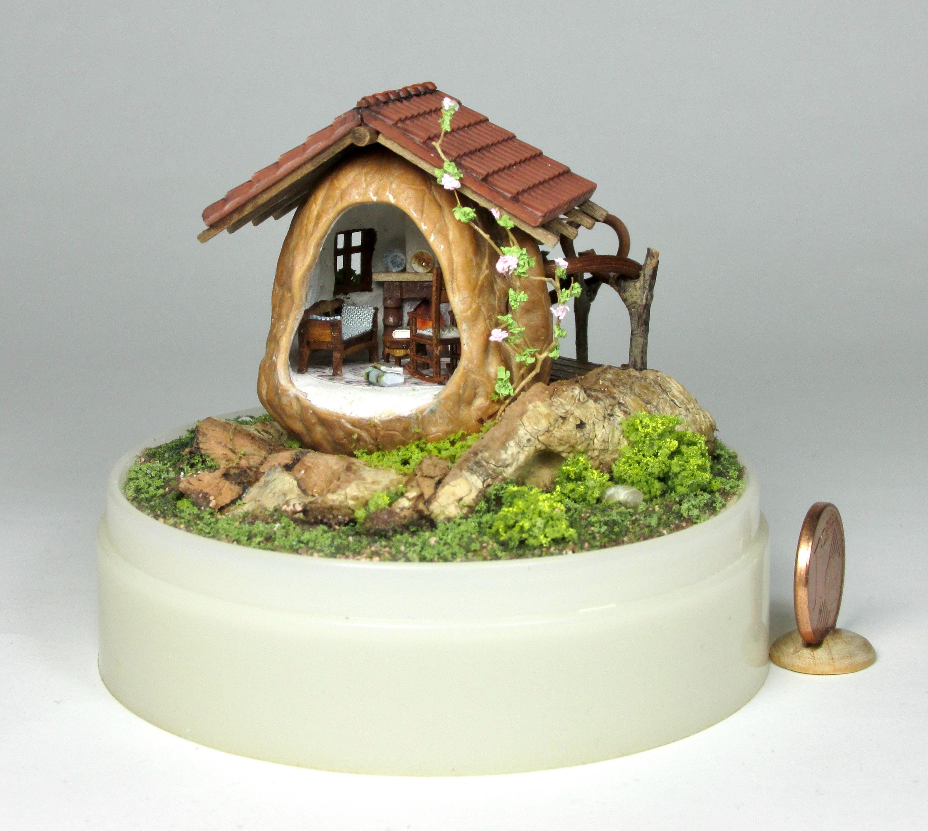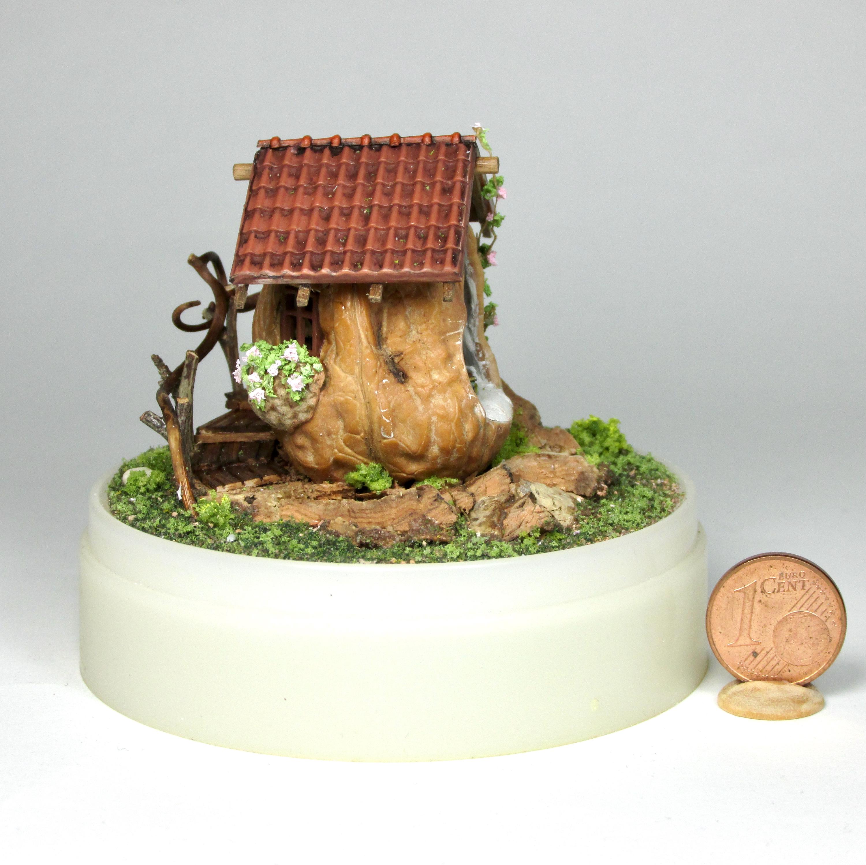 When I found these beautiful walnuts, I couldn't resist hollowing them out to create a home for little creatures: fairies, perhaps? The work is time-consuming, but the result is very decorative! So here's a cozy living room with a fireplace, a sofa and rocking chair, a coffee table with books, and, outside, greenery and flowers, all in 1/144 scale. Made from natural materials—wood, foam, cork, vine leaves—the mini landscape is protected from dust by an acrylic dome, but if you want to remove it, you'll need to remove the screw at the base.