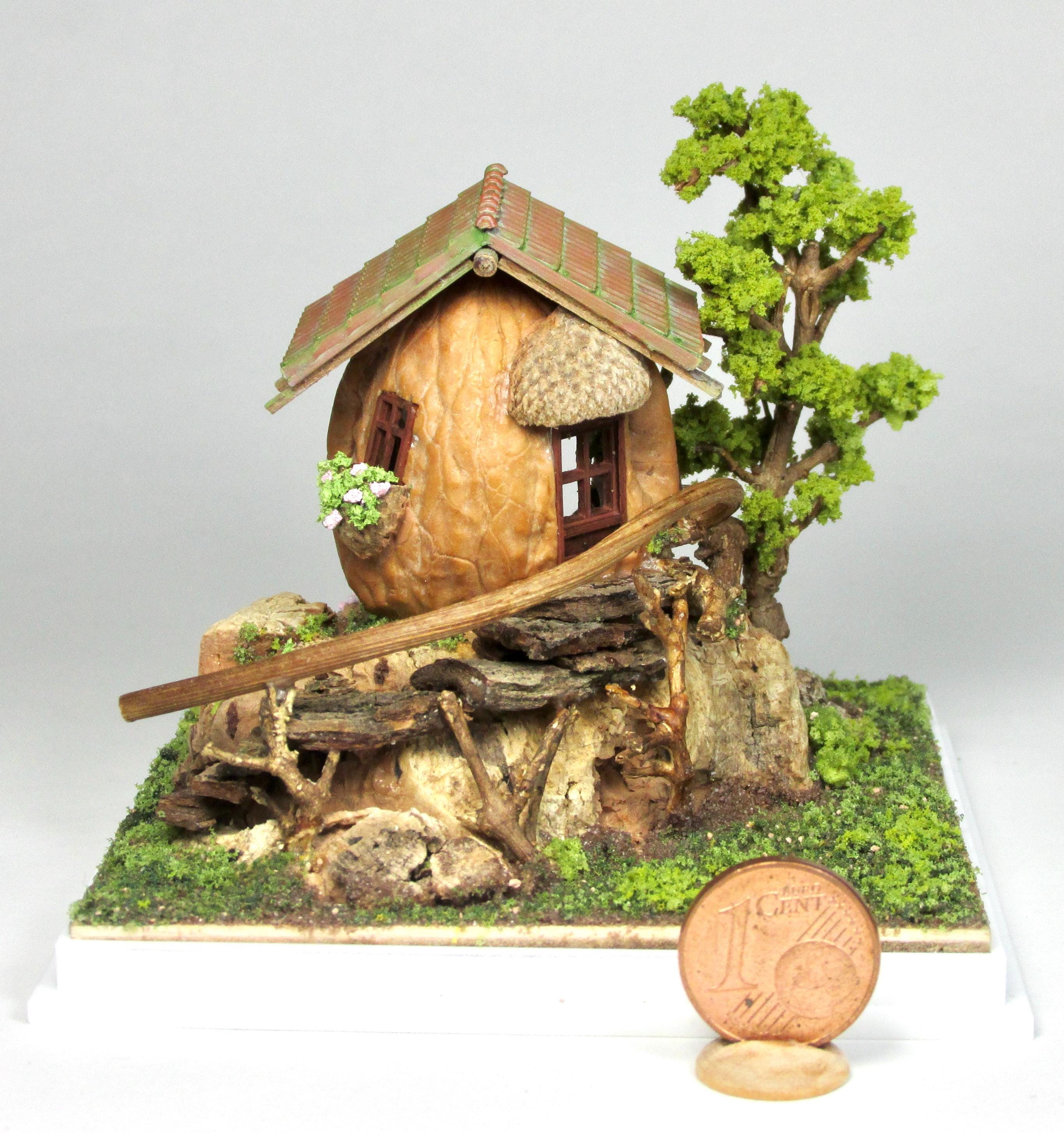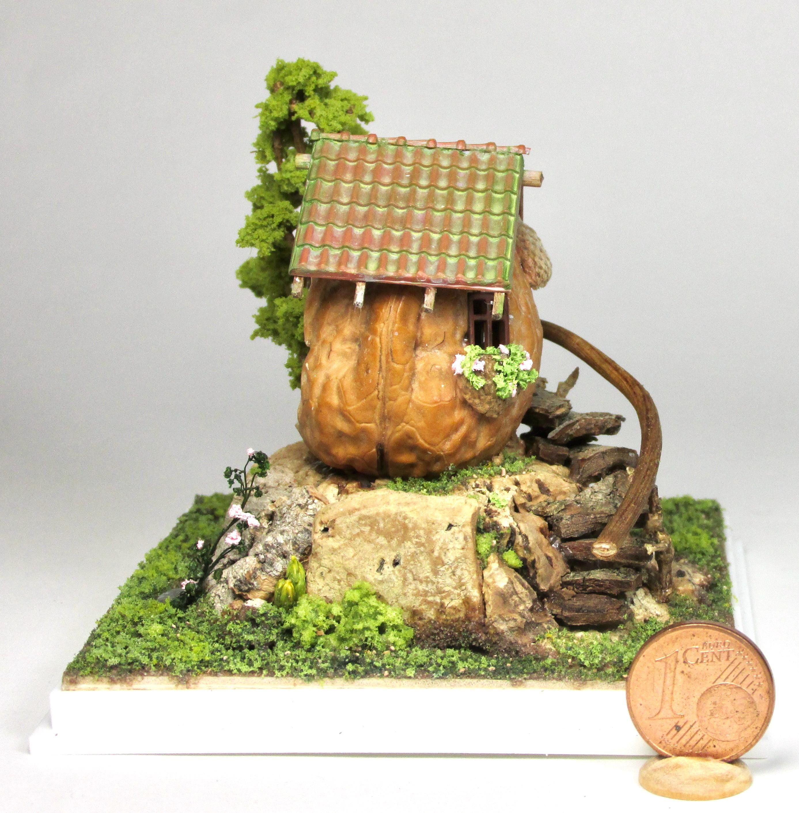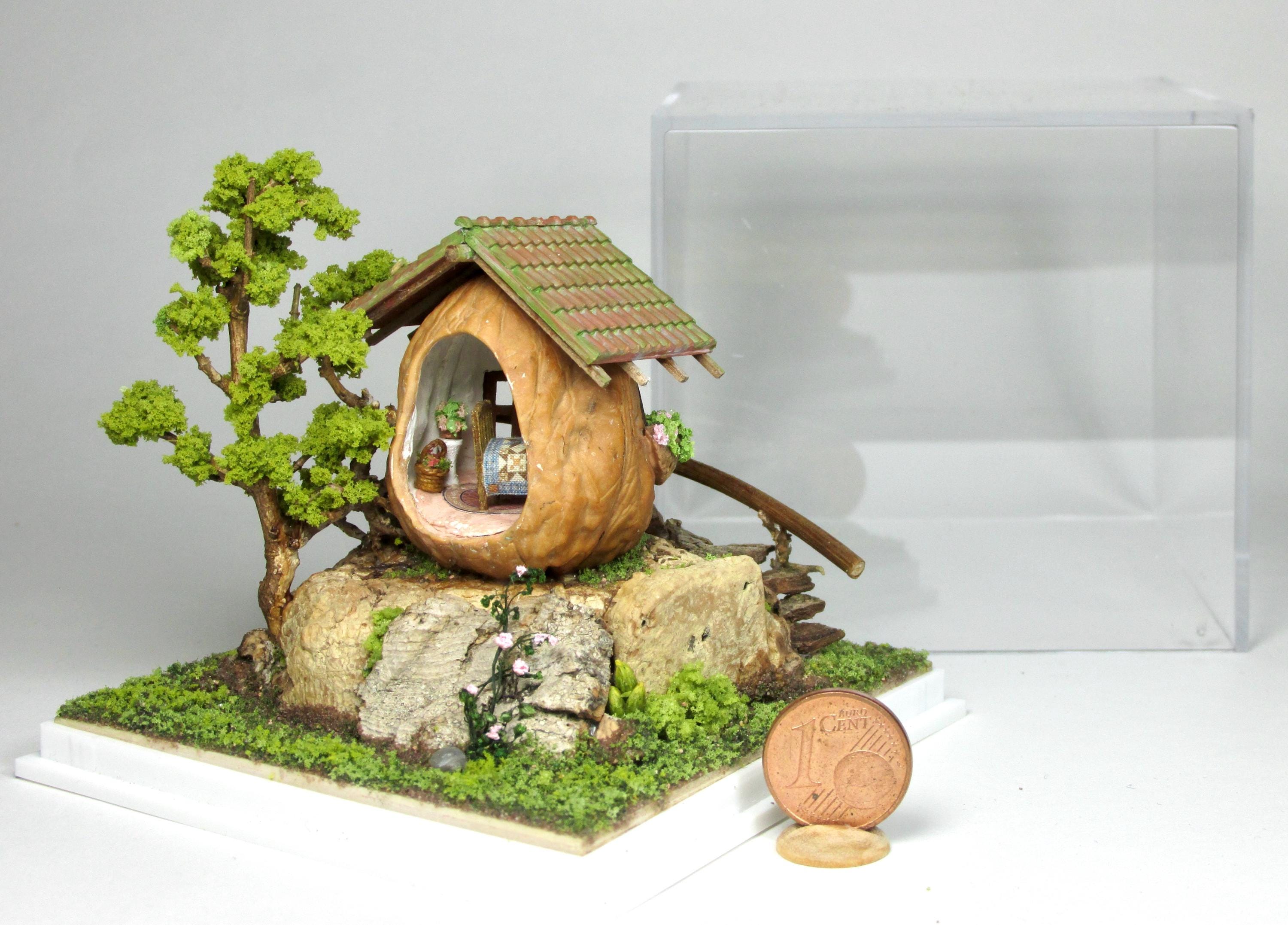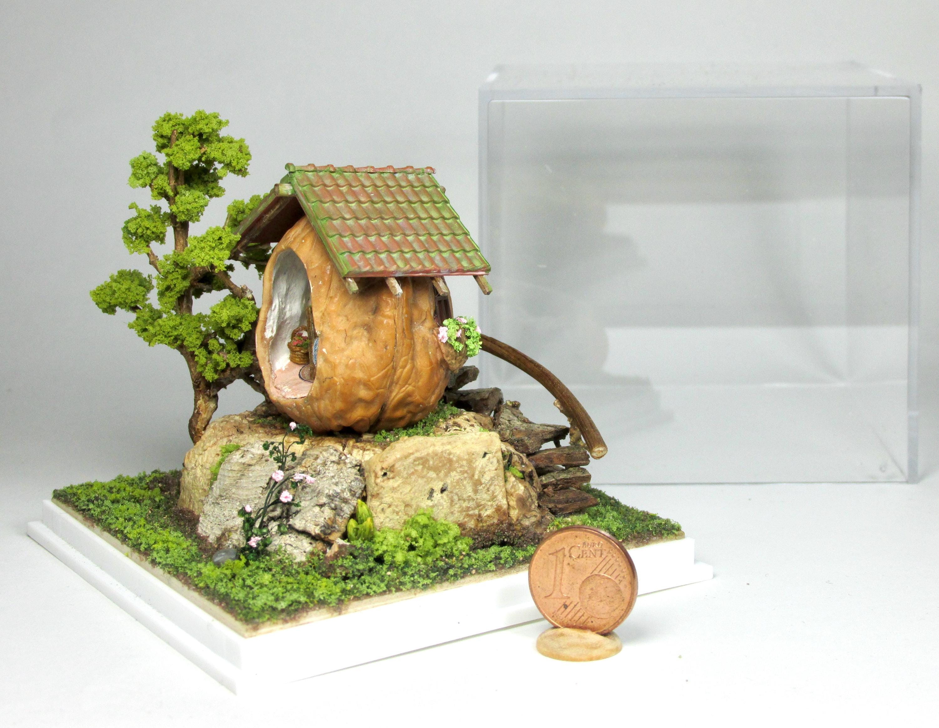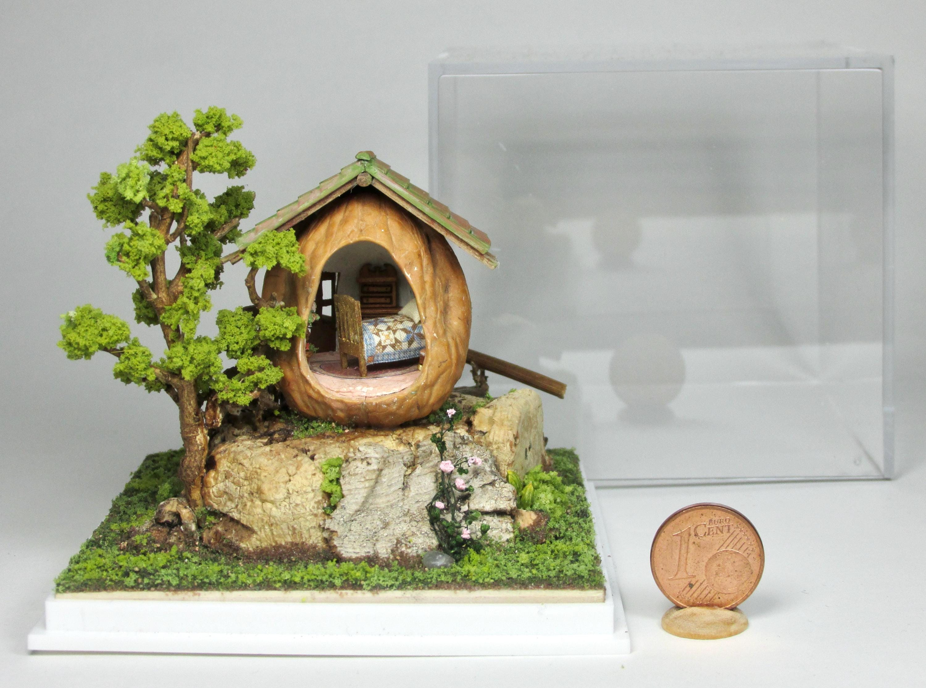 When I found these beautiful walnuts, I couldn't resist hollowing them out to create a home for little creatures: fairies, perhaps? The work is time-consuming, but the result is very decorative! And so, here's a cozy bedroom with a bed and dresser, and, outside, greenery, flowers, and a beautiful tree, all in 1/144 scale. Made from natural materials—wood, foam, cork, vine leaves—the mini landscape is protected from dust by a removable acrylic lid.