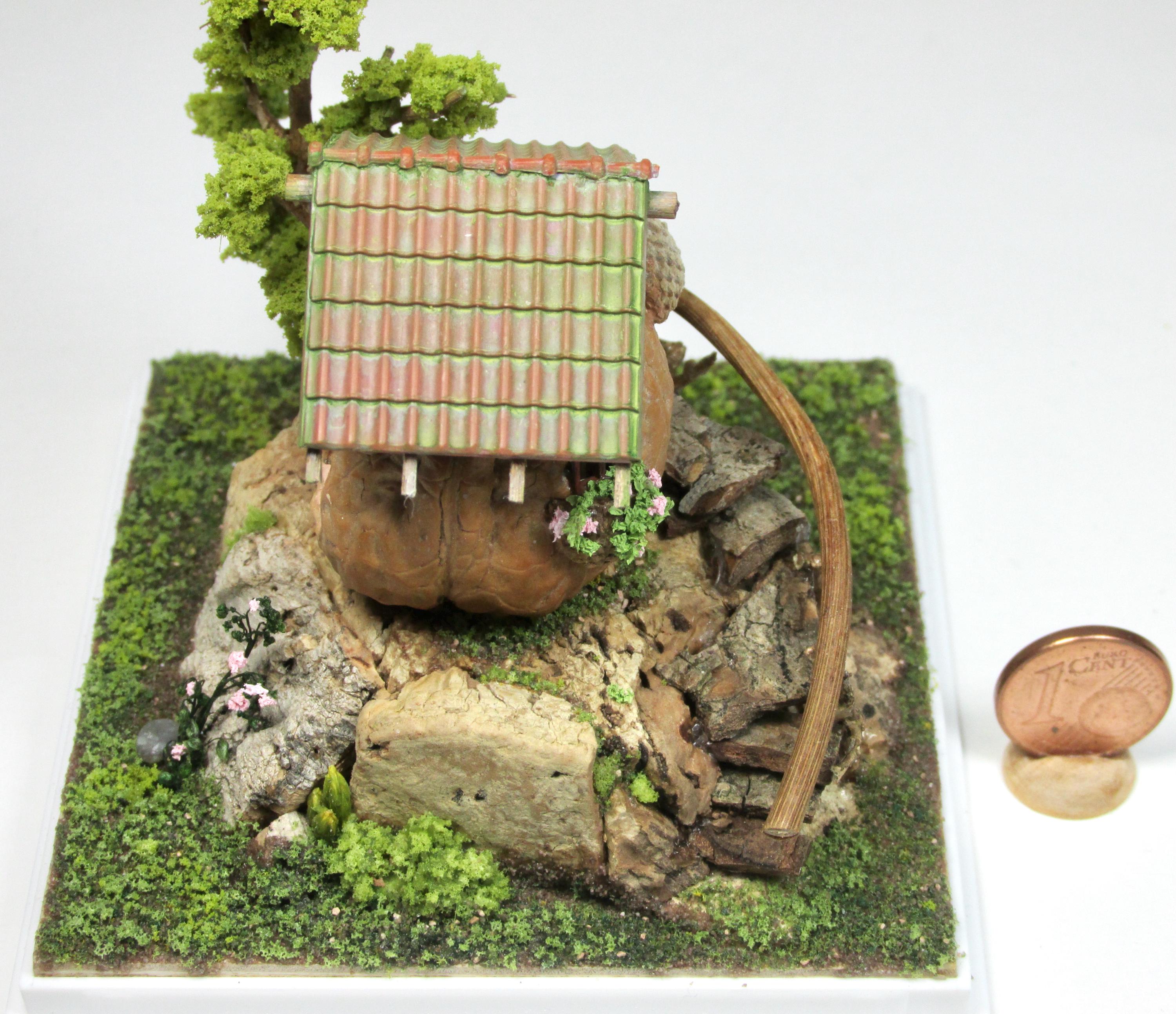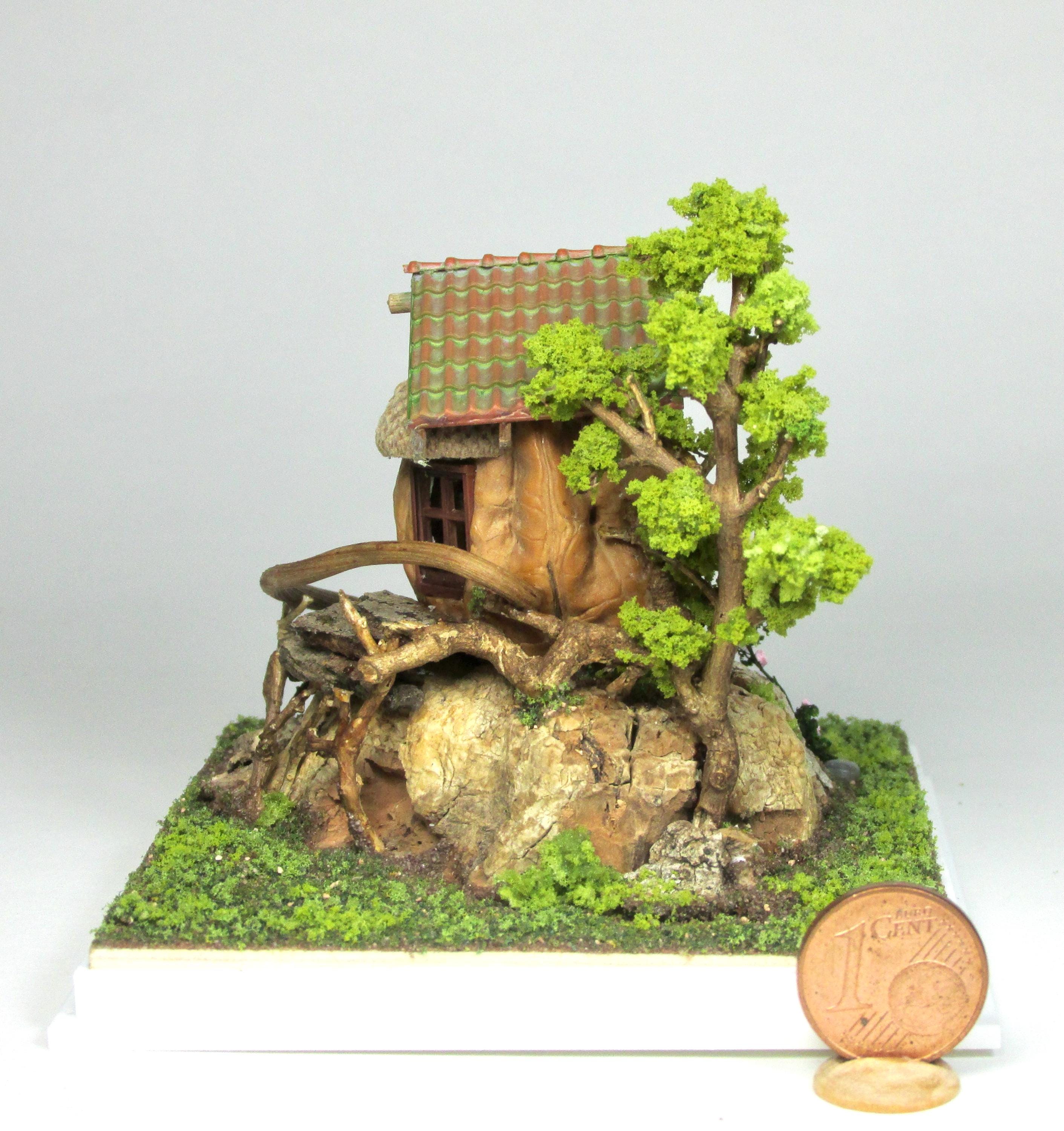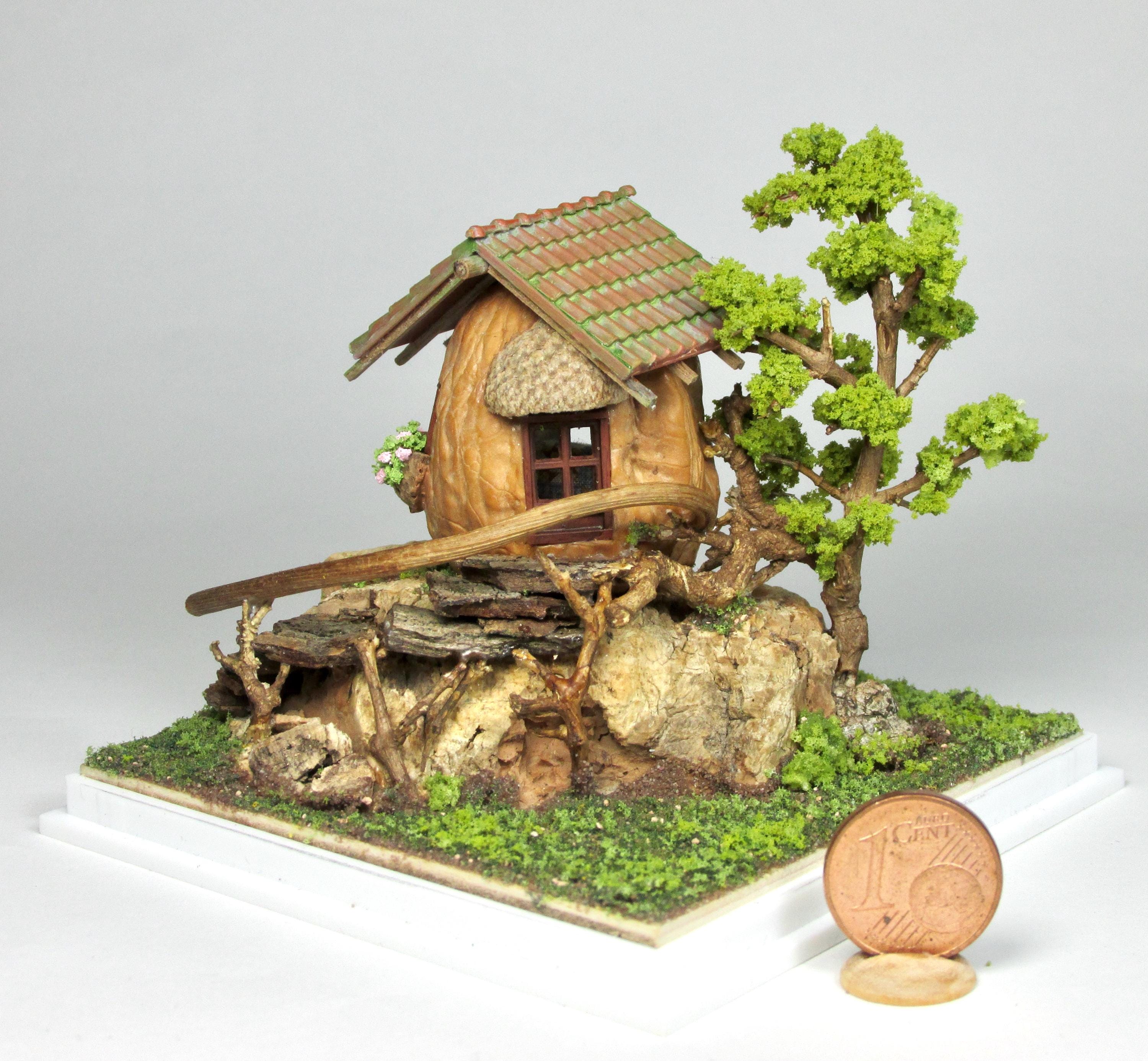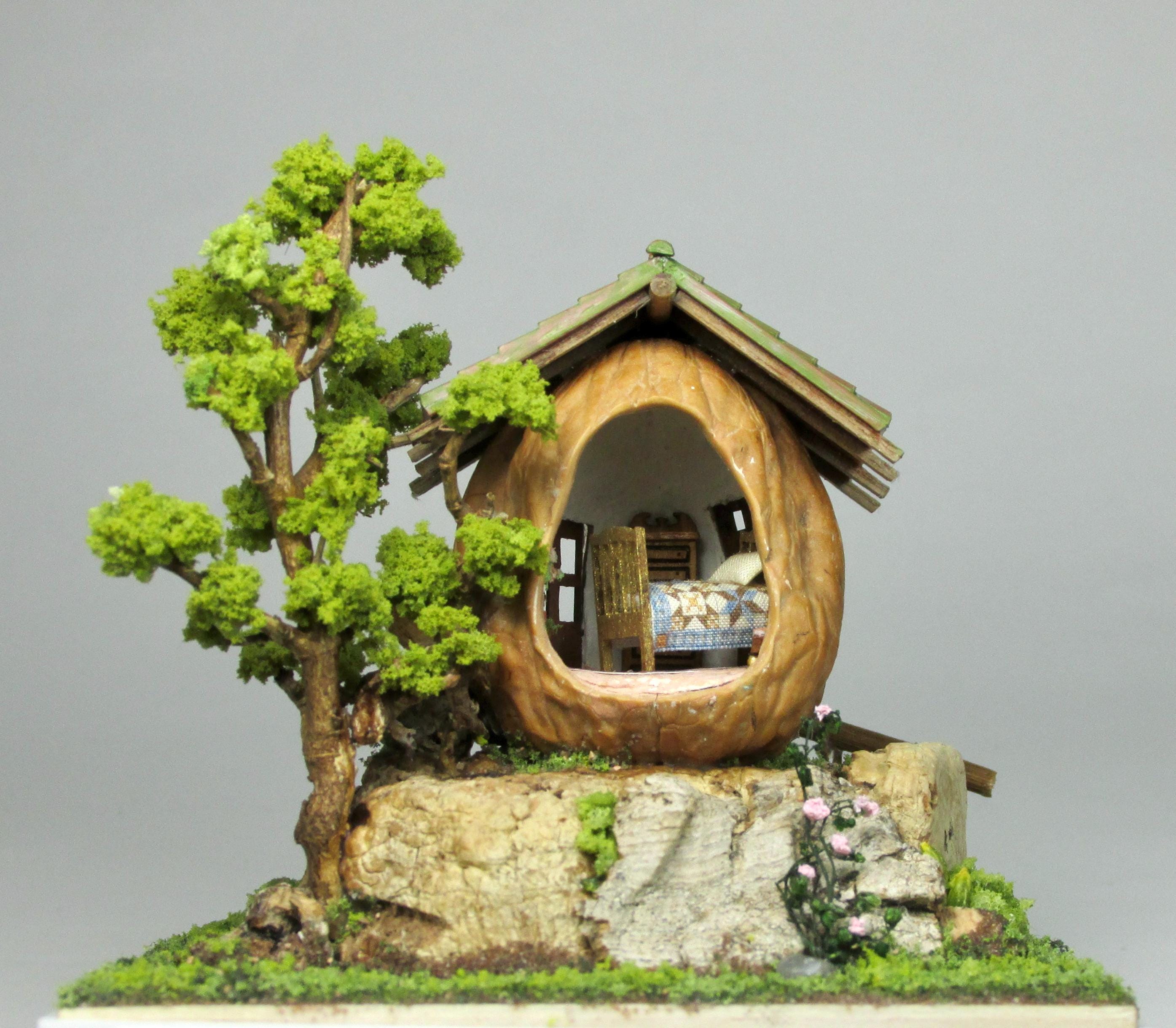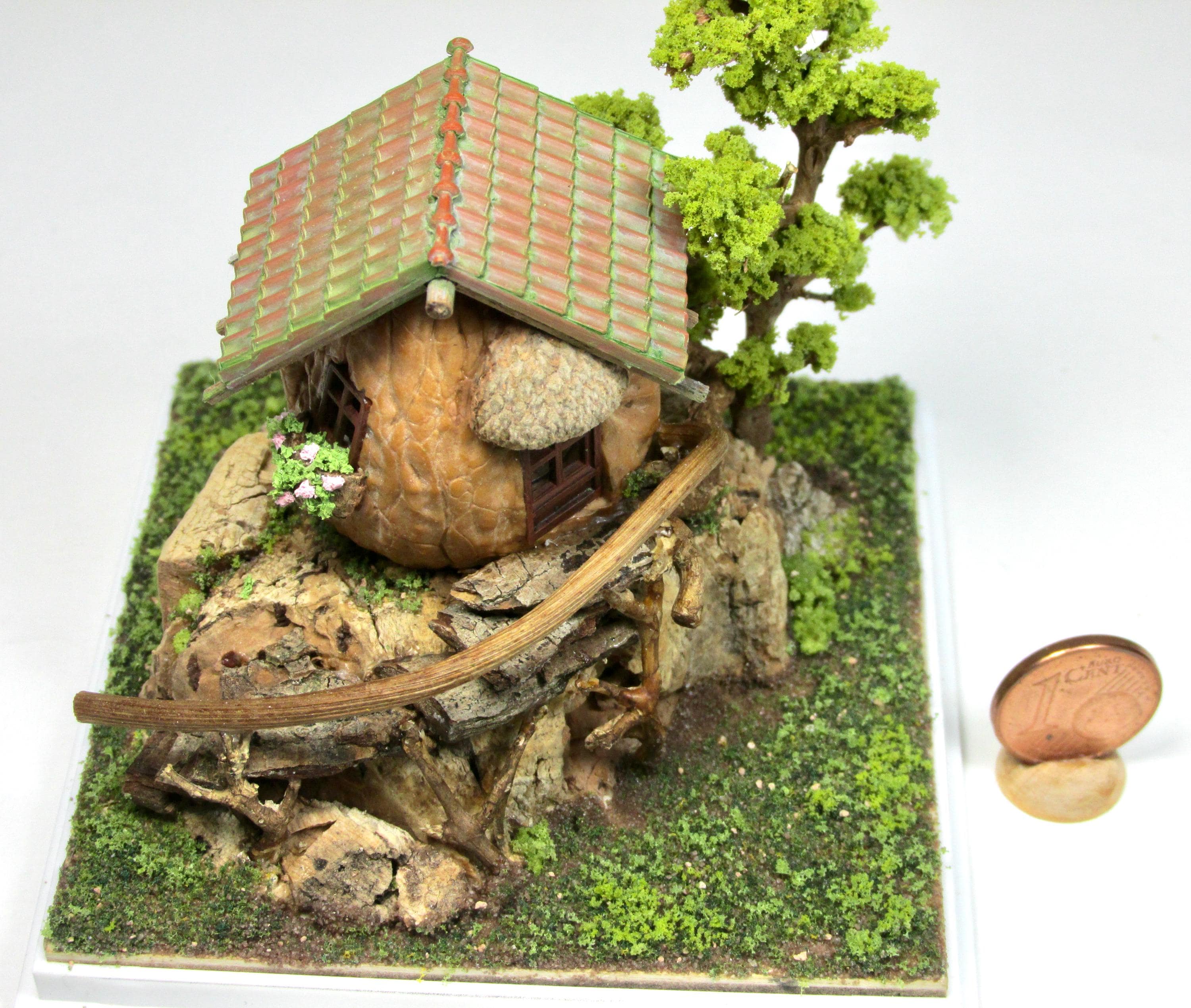 When I found these beautiful walnuts, I couldn't resist hollowing them out to create a home for little creatures: fairies, perhaps? The work is time-consuming, but the result is very decorative! And so, here's a cozy bedroom with a bed and dresser, and, outside, greenery, flowers, and a beautiful tree, all in 1/144 scale. Made from natural materials—wood, foam, cork, vine leaves—the mini landscape is protected from dust by a removable acrylic lid.