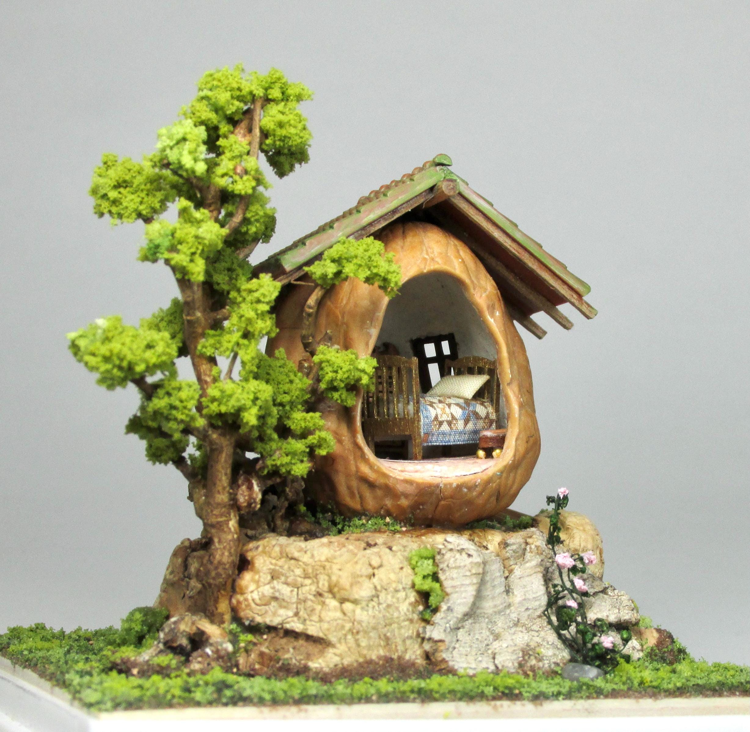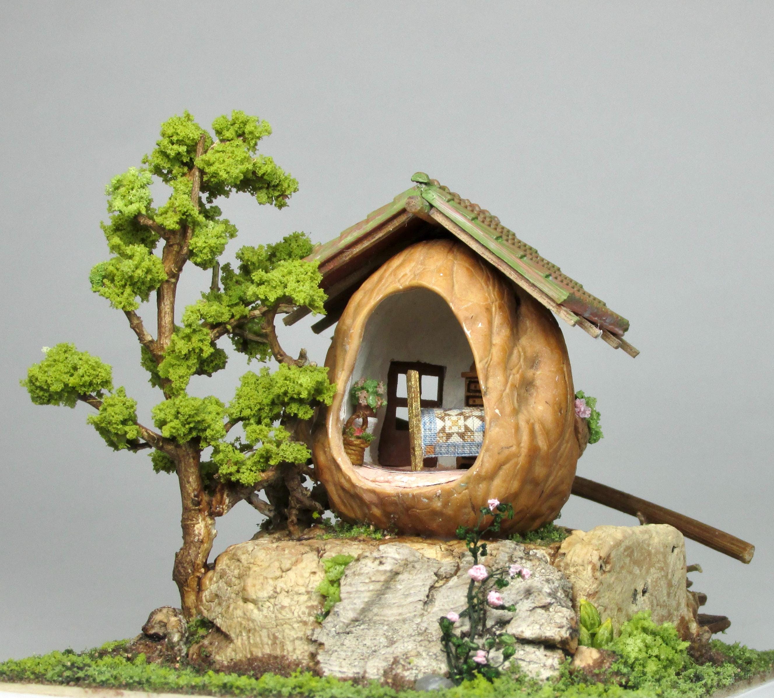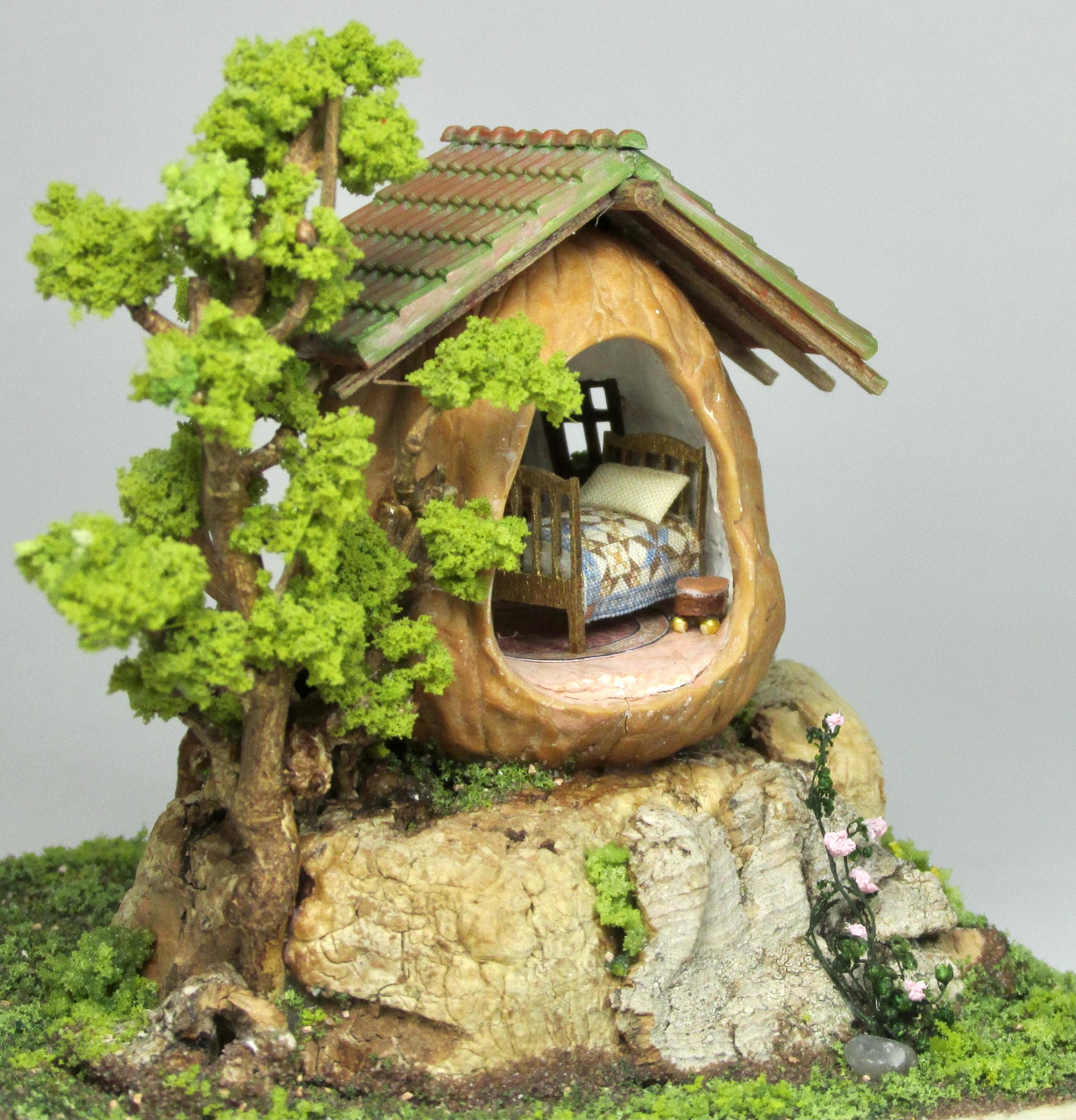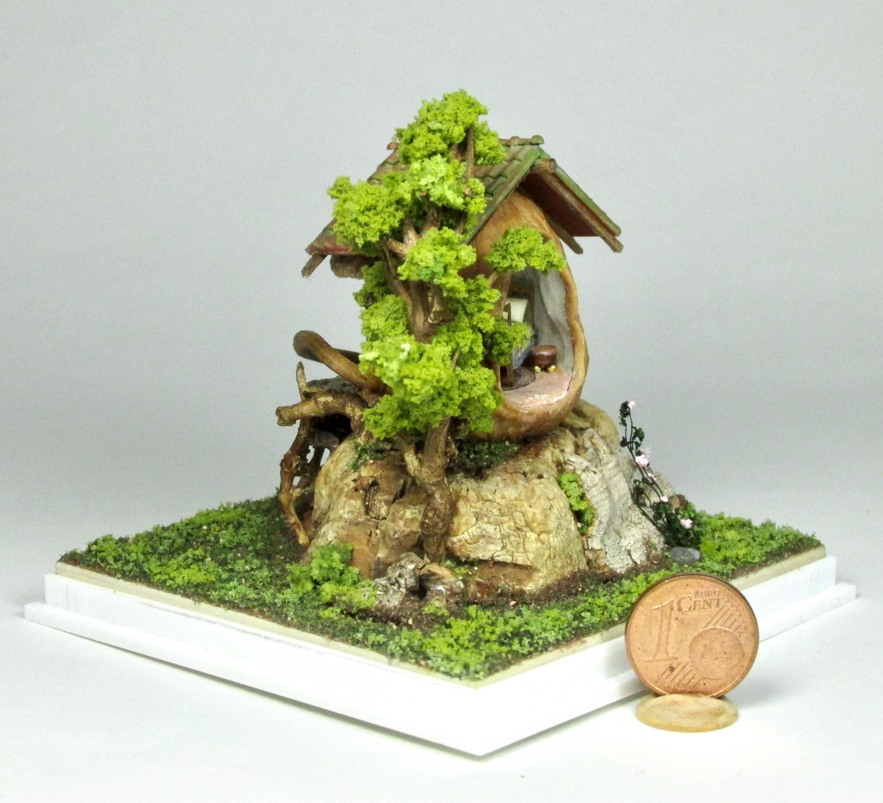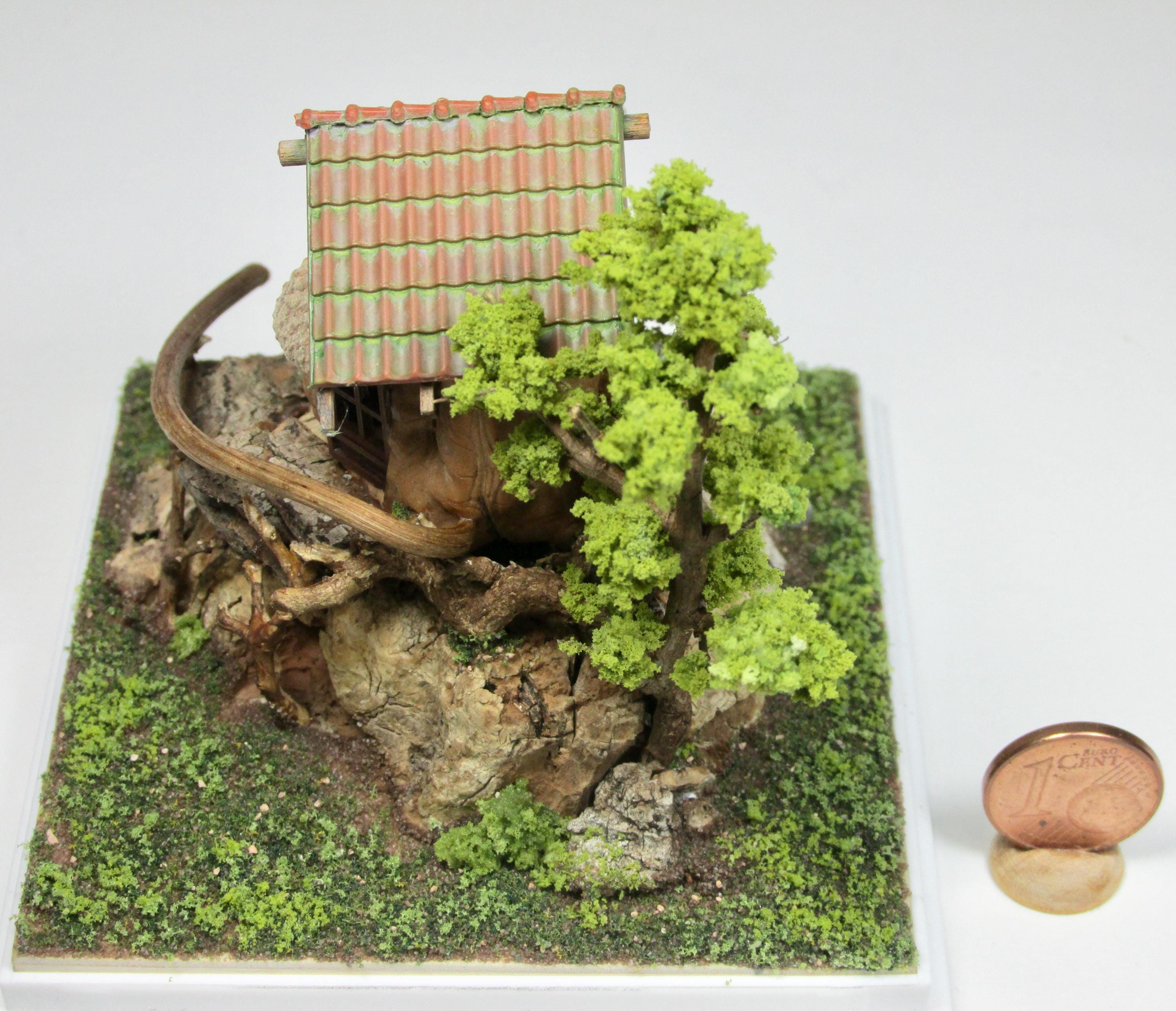When I found these beautiful walnuts, I couldn't resist hollowing them out to create a home for little creatures: fairies, perhaps? The work is time-consuming, but the result is very decorative! And so, here's a cozy bedroom with a bed and dresser, and, outside, greenery, flowers, and a beautiful tree, all in 1/144 scale. Made from natural materials—wood, foam, cork, vine leaves—the mini landscape is protected from dust by a removable acrylic lid.