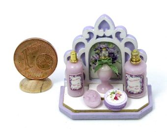 Precious miniature display with perfume bottles and soap, handmade, scale 1/12, OOAK